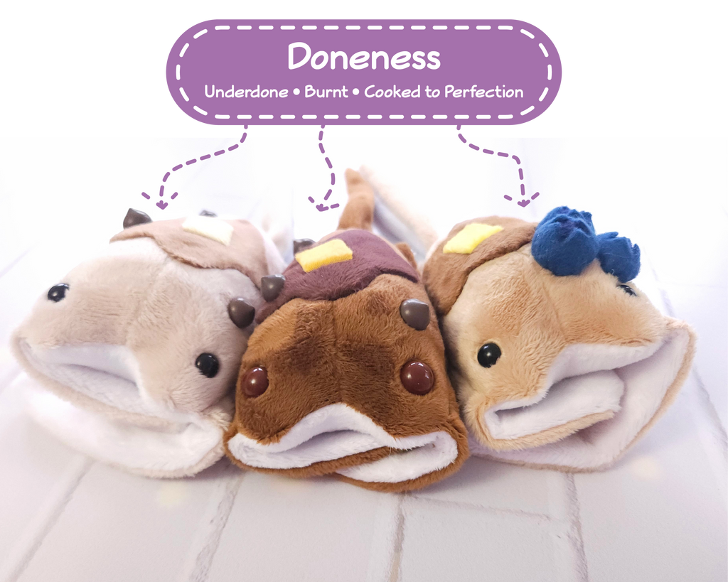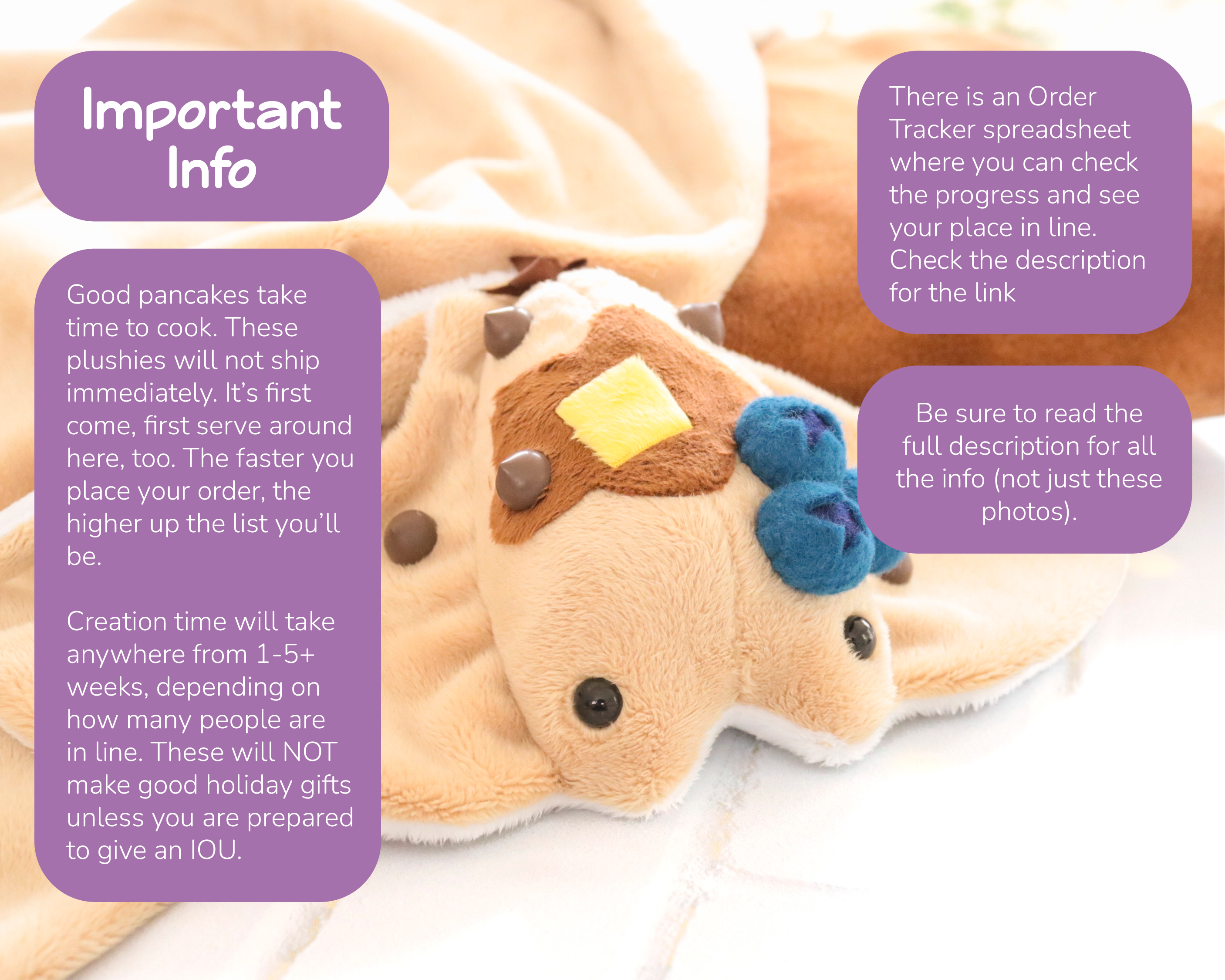 Good pancakes take time to cook. These plushies will not ship immediately. All pancakes will be sewn first, then stuffed, finished, and shipped out in the order they were purchased.