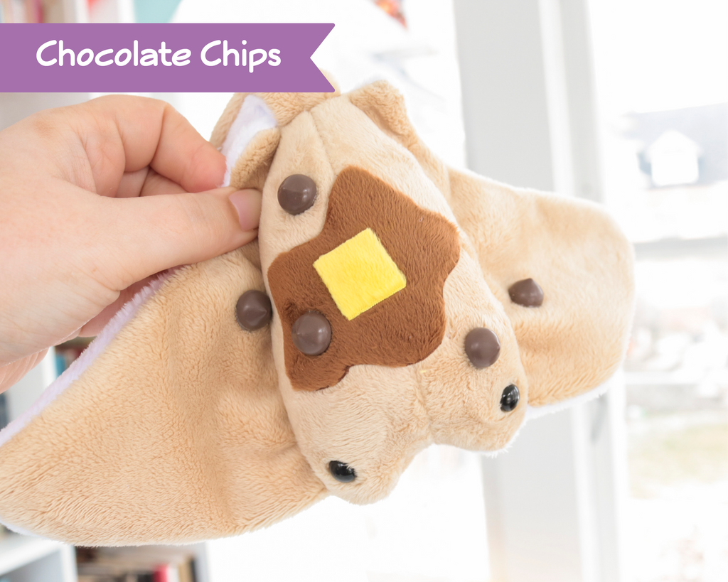 Chocolate Chips - Sprinkle on 5 plastic chocolate chips. The minky is trimmed below them, the bottoms of each chip are sanded, and they're glued in place with industrial strength craft glue to keep them secure. The position of your chocolate chips may change if you add blueberries or bananas to accommodate them.