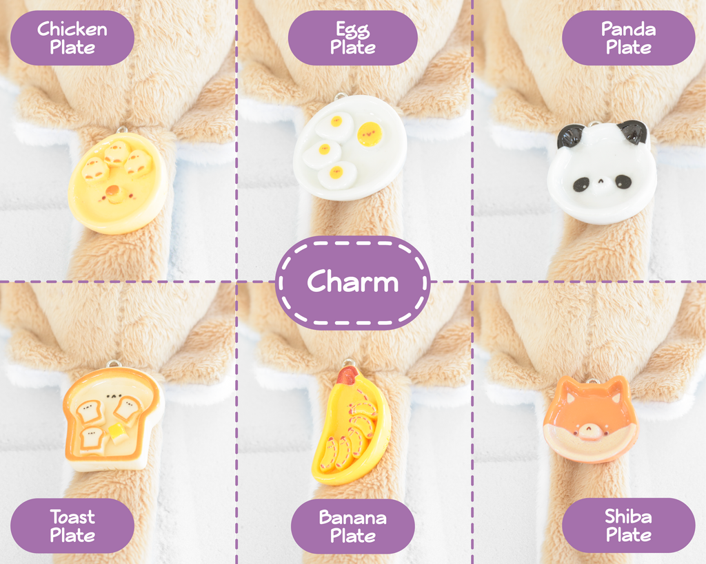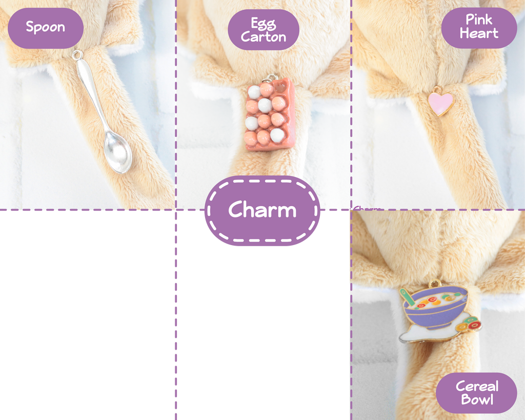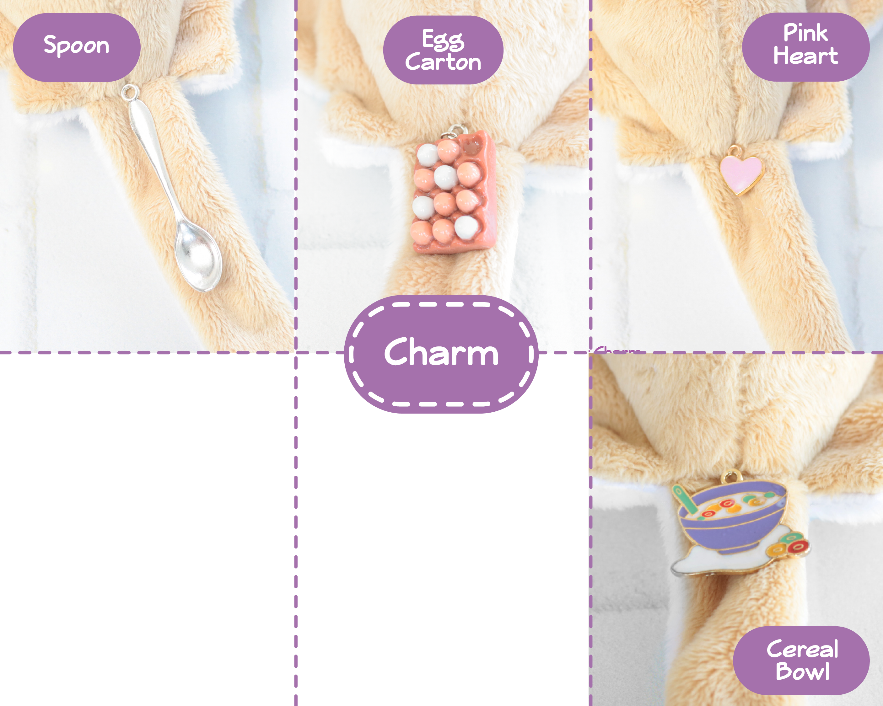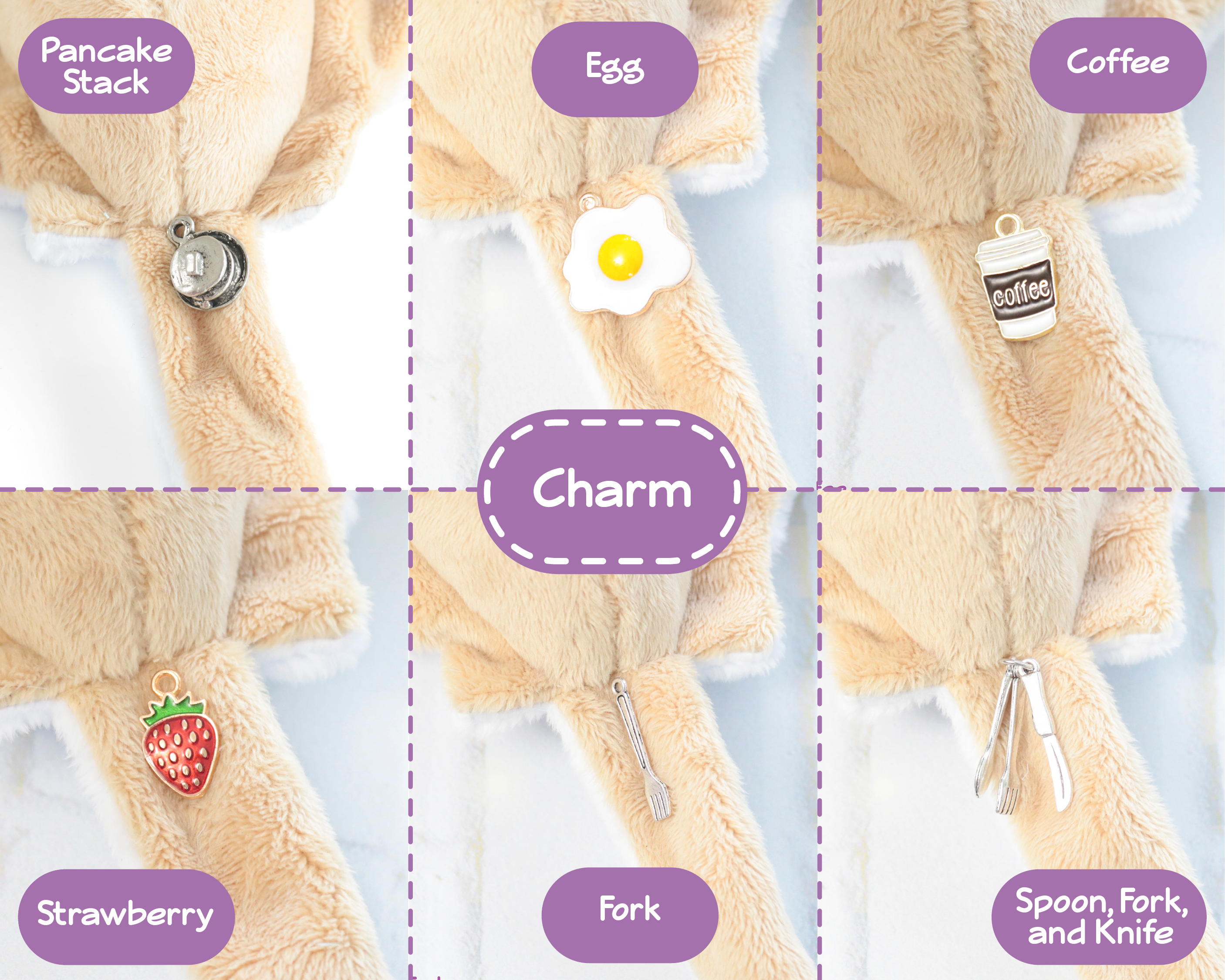 Add a charm to the base of your pancakes tail! These will be sewn to the base of the tail with a thread that matches the color of your pancakes body. If you also order a bow, they'll be placed just underneath so both will still be visible. See the photos for all the options. Some charm types are limited in quantity.