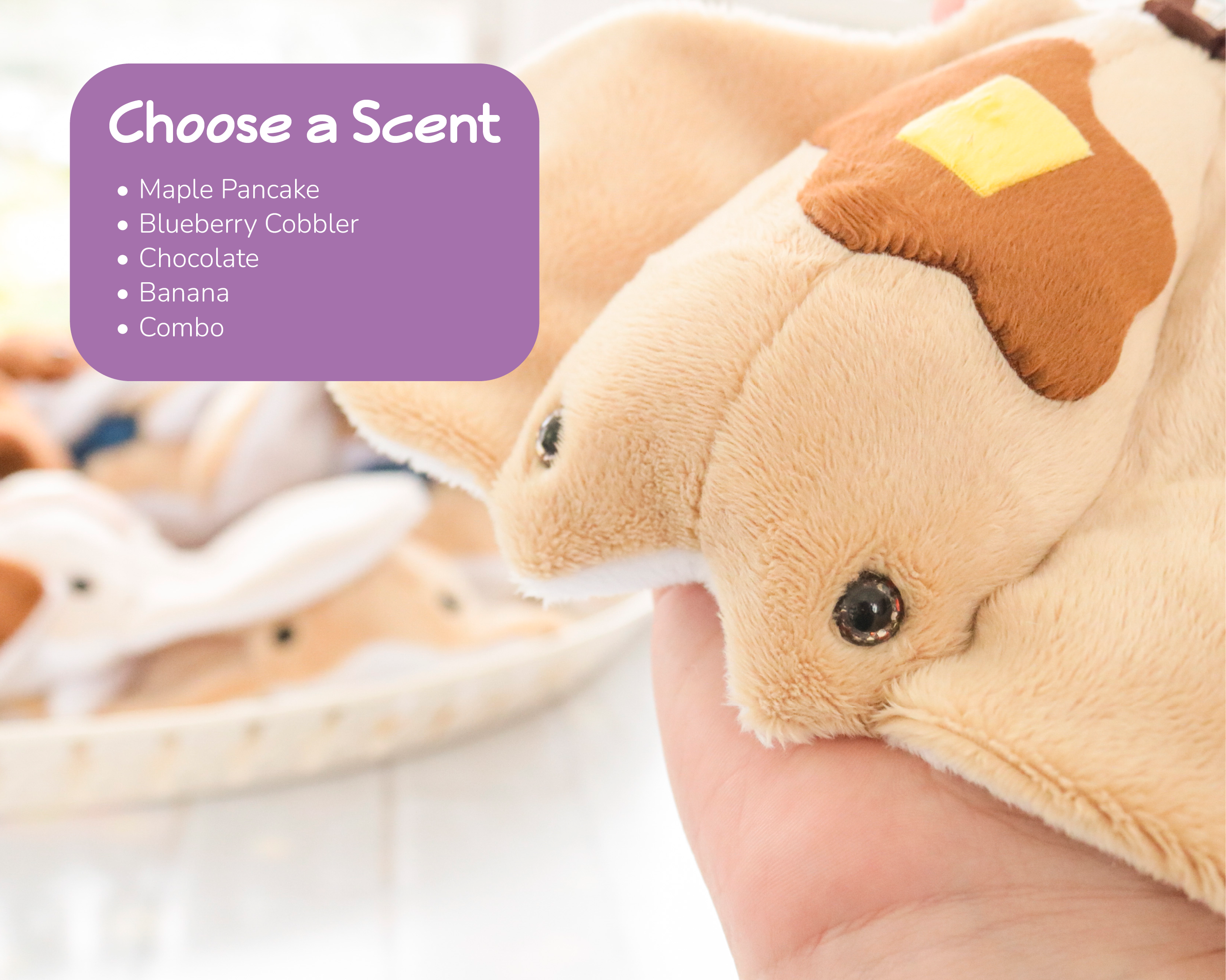 Default scents include maple pancake, blueberry cobbler, chocolate, banana, and combinations of those. Please note that these scents can be very strong, especially the maple pancake, so this may not be a good option if you're sensitive or allergic to certain smells. Scents can last anywhere from 1 month to a year depending on a variety of factors including the chemical makeup of the scent itself and the environment it's kept in. The average lifespan for scents is 3-6 months. Storing your plush in an airtight container when not in use will help the scent last longer.