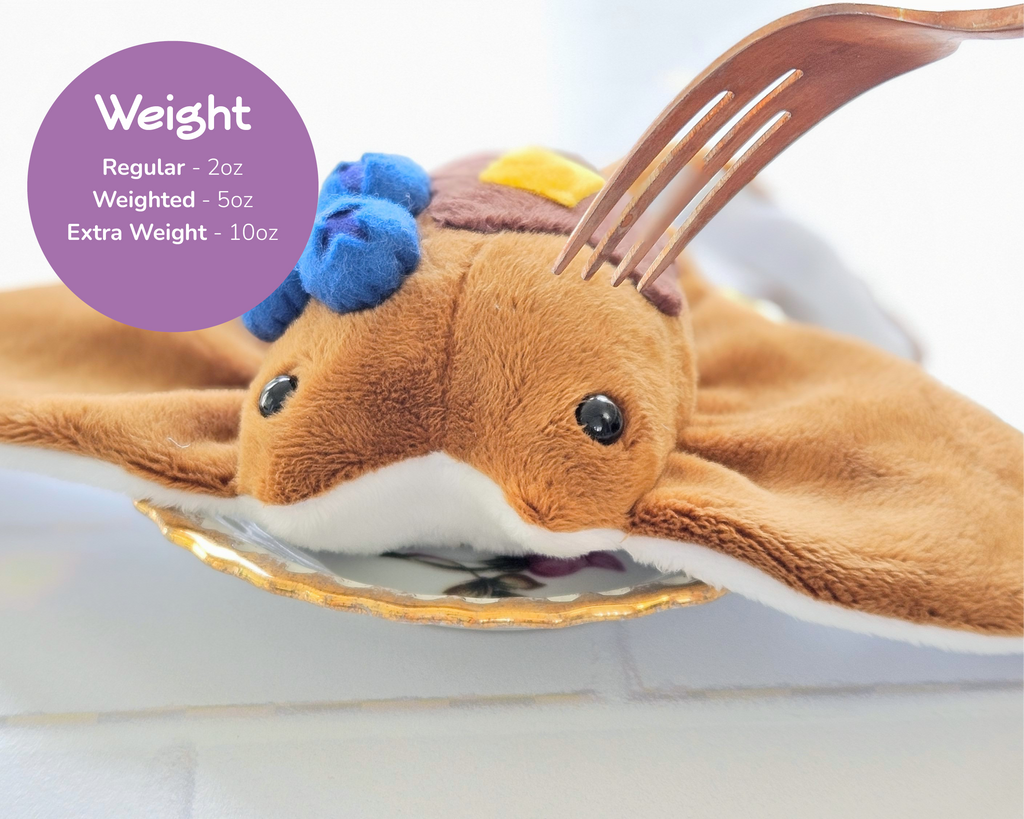 Weighted - Half full of microbeads and half full of stuffing, weighted pancakes weigh around 5 ounces