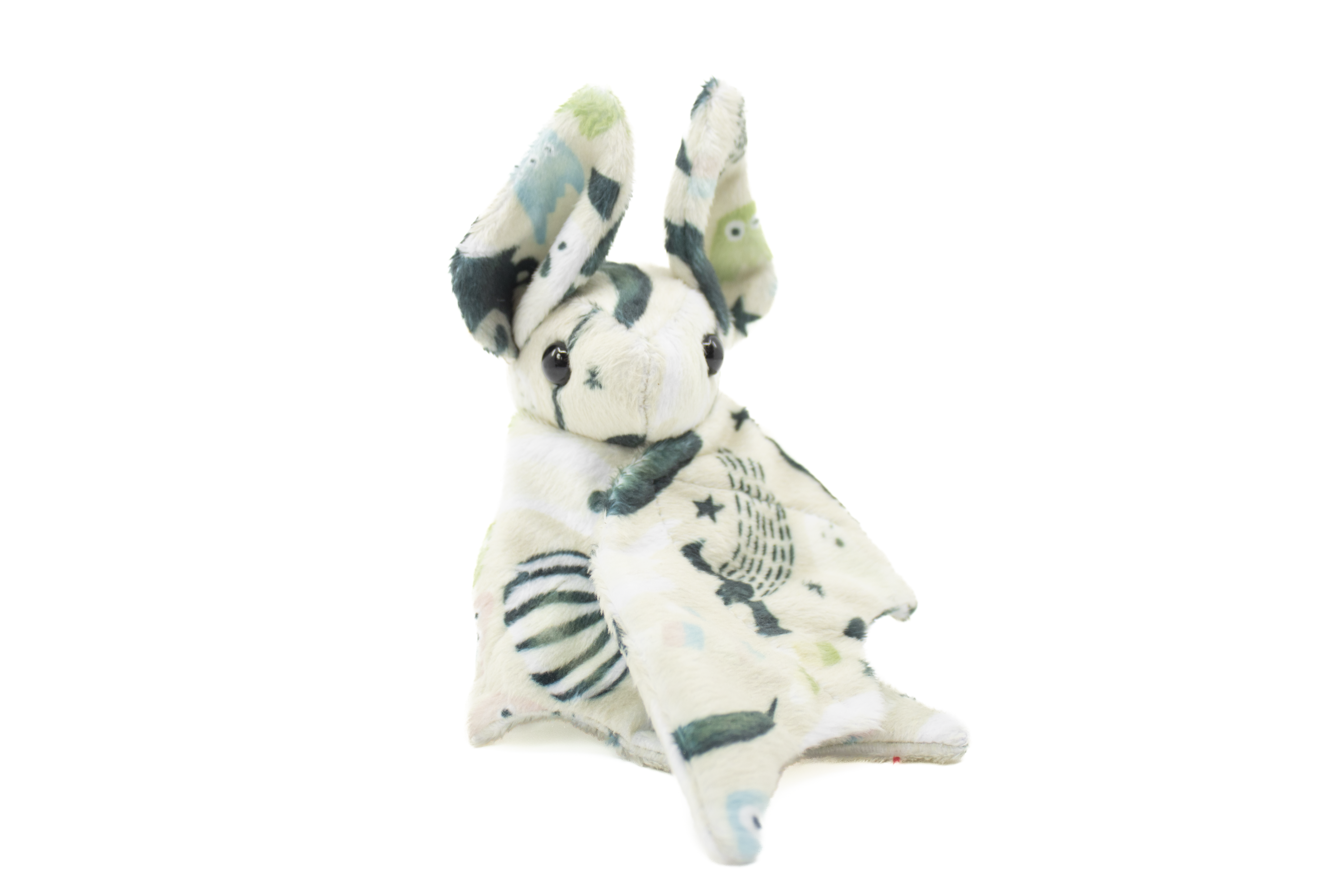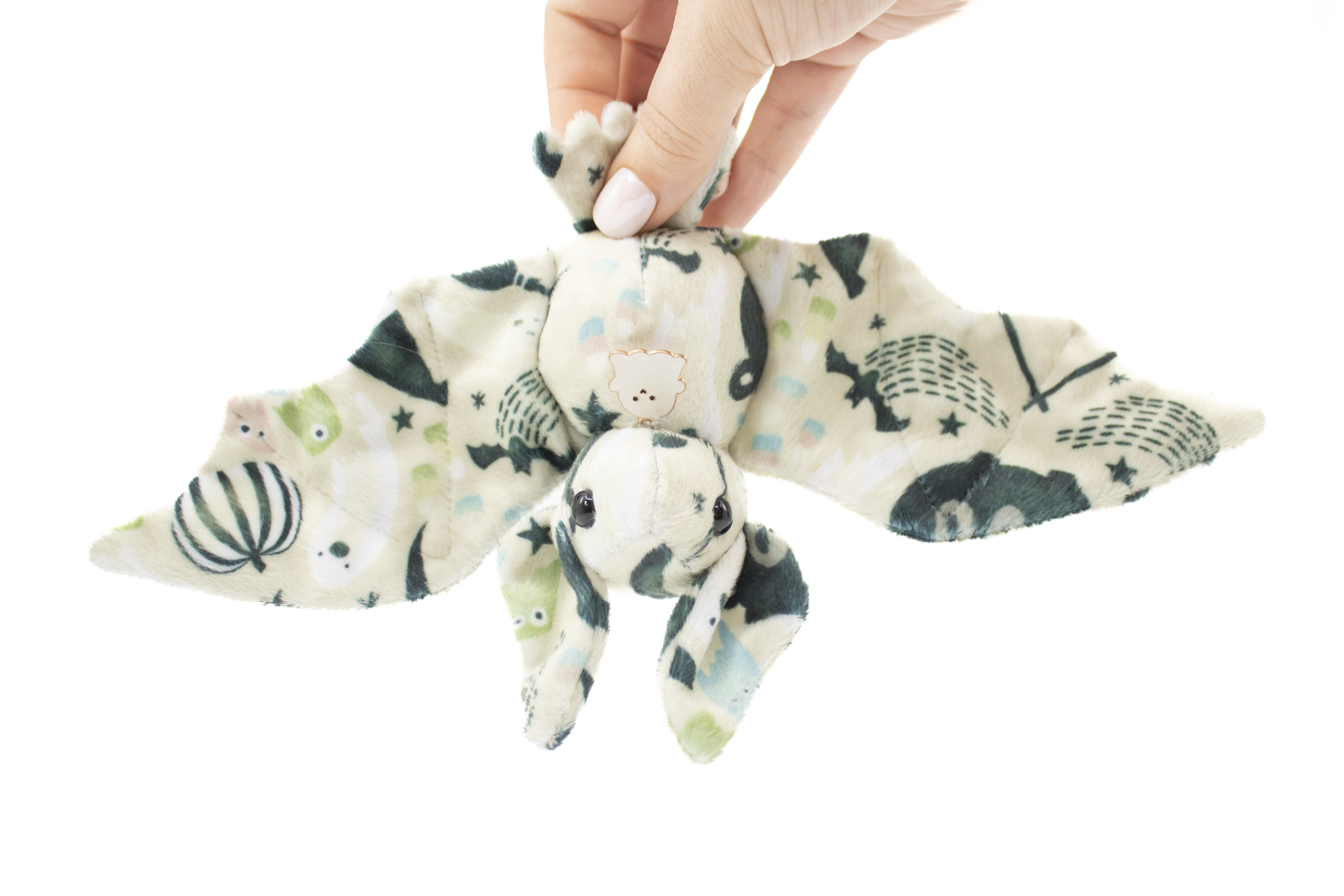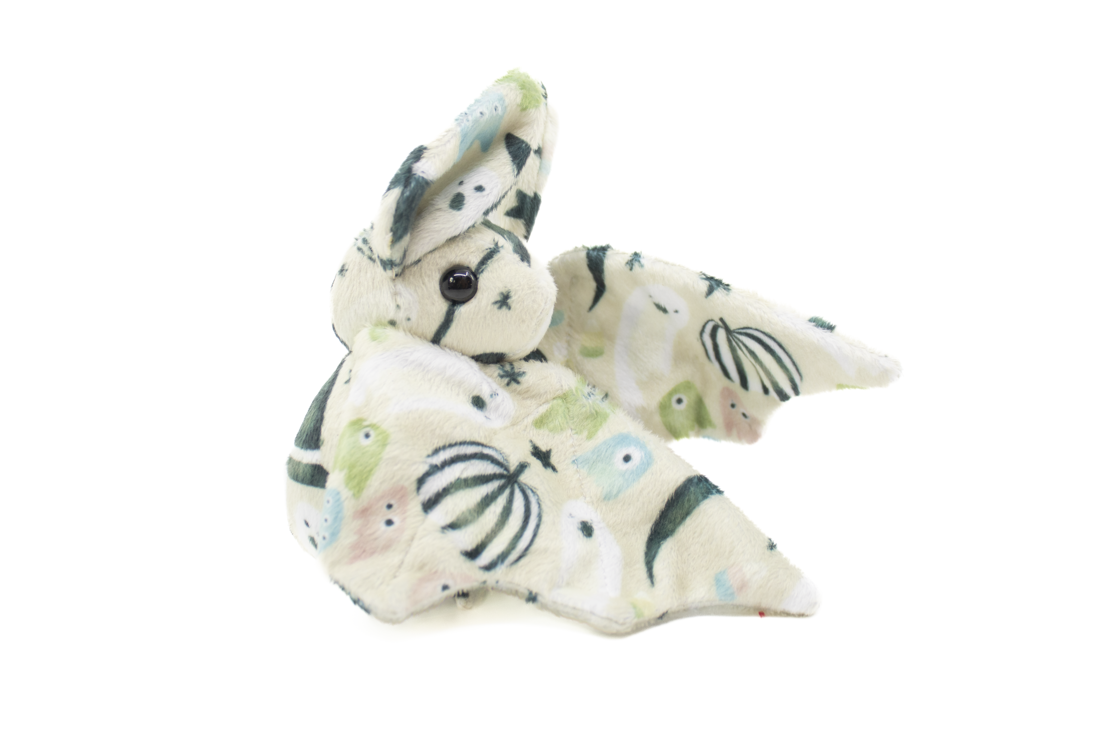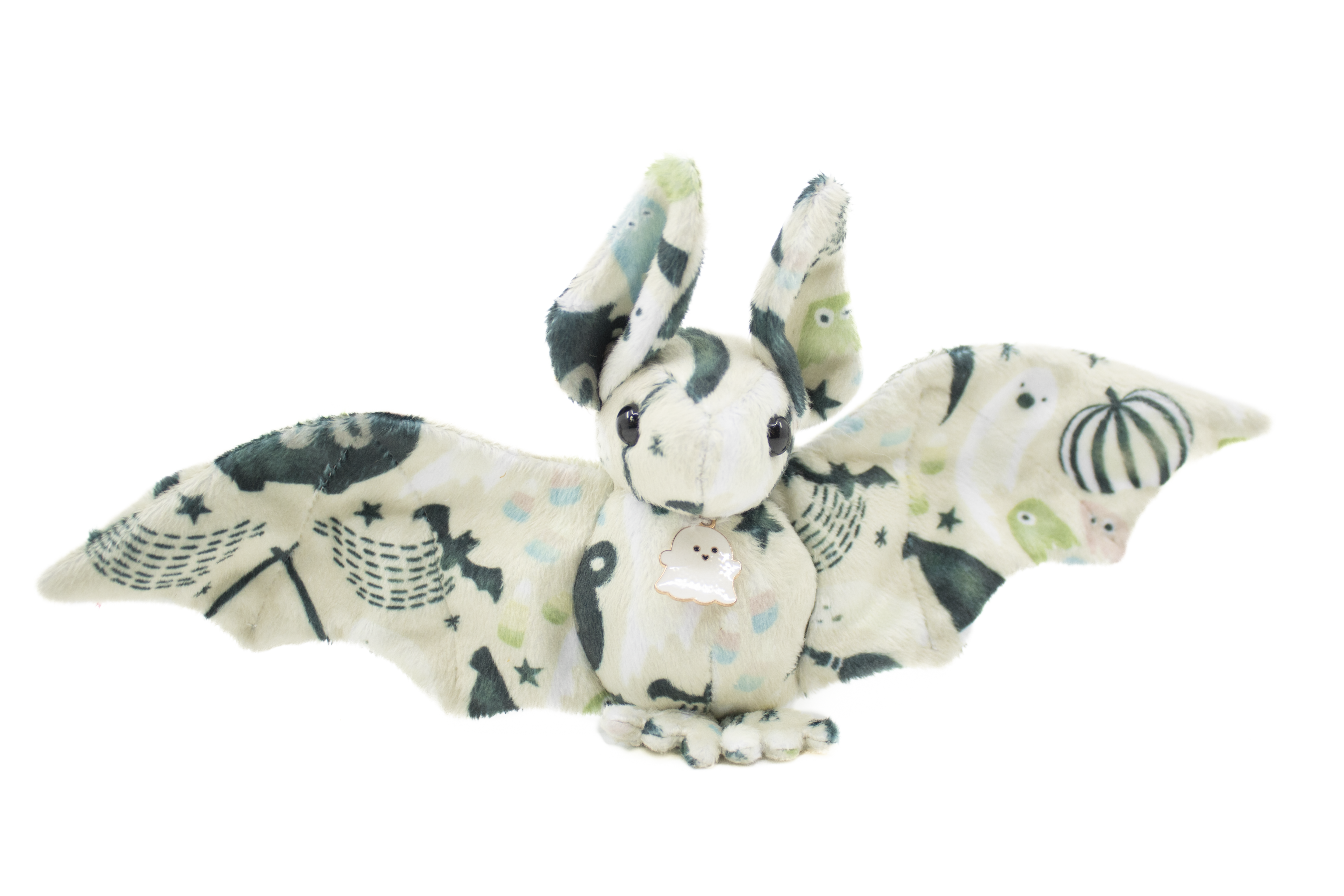 Bring a touch of Halloween fun to your space with this handmade bat plush. Created with printed minky this bat features colorful halloween designs on a tan background. One bat has a happy ghost charm as it's neck and the other has an angry one. It would make the perfect companion during spooky season celebrations.
