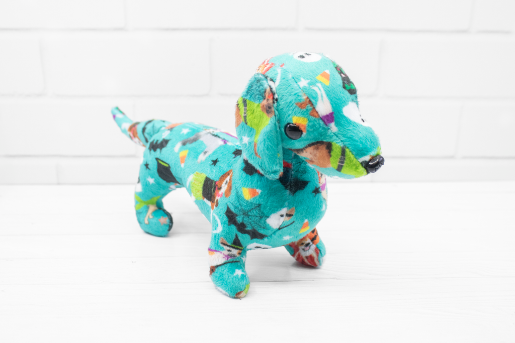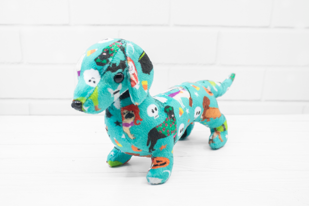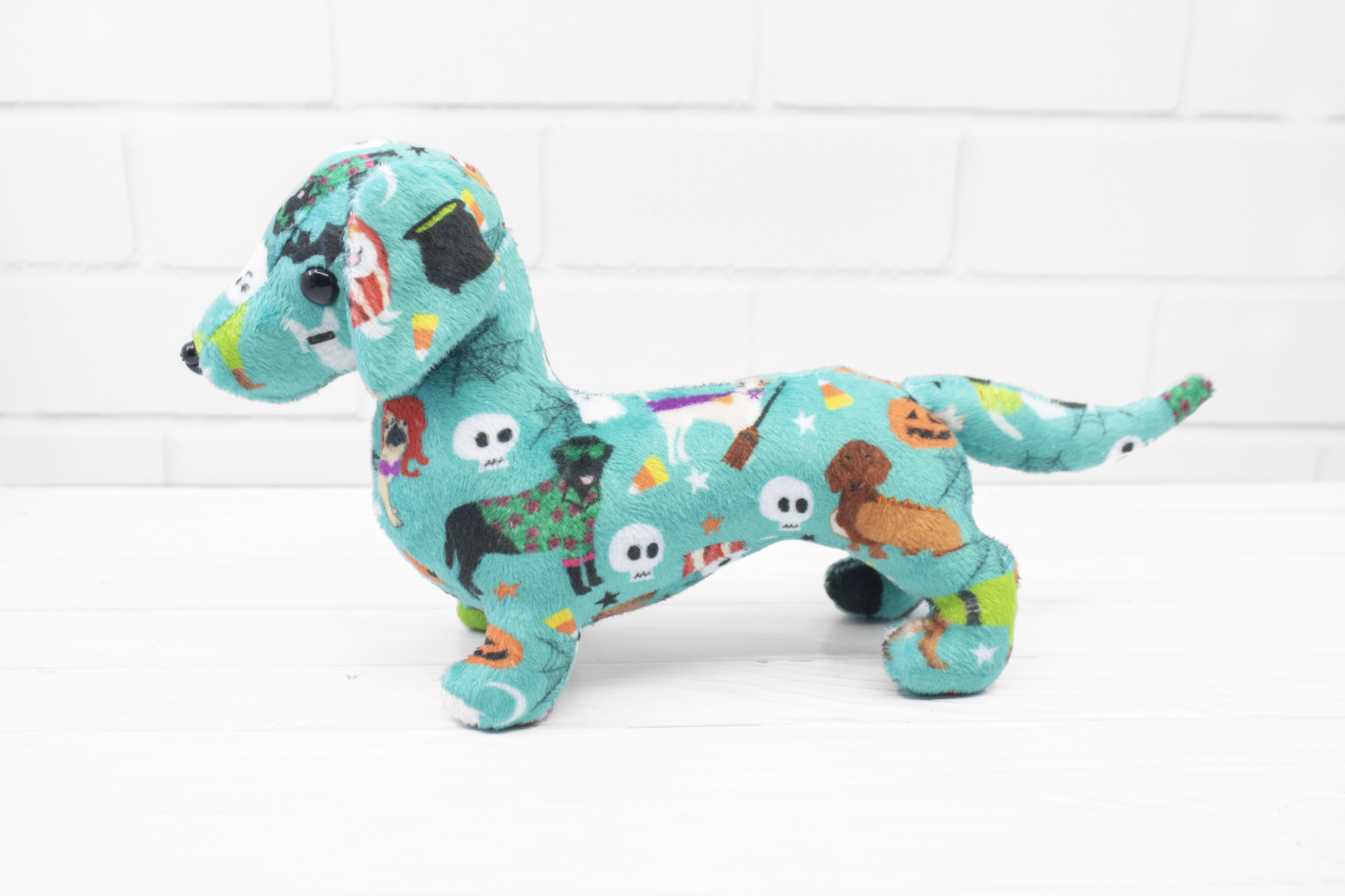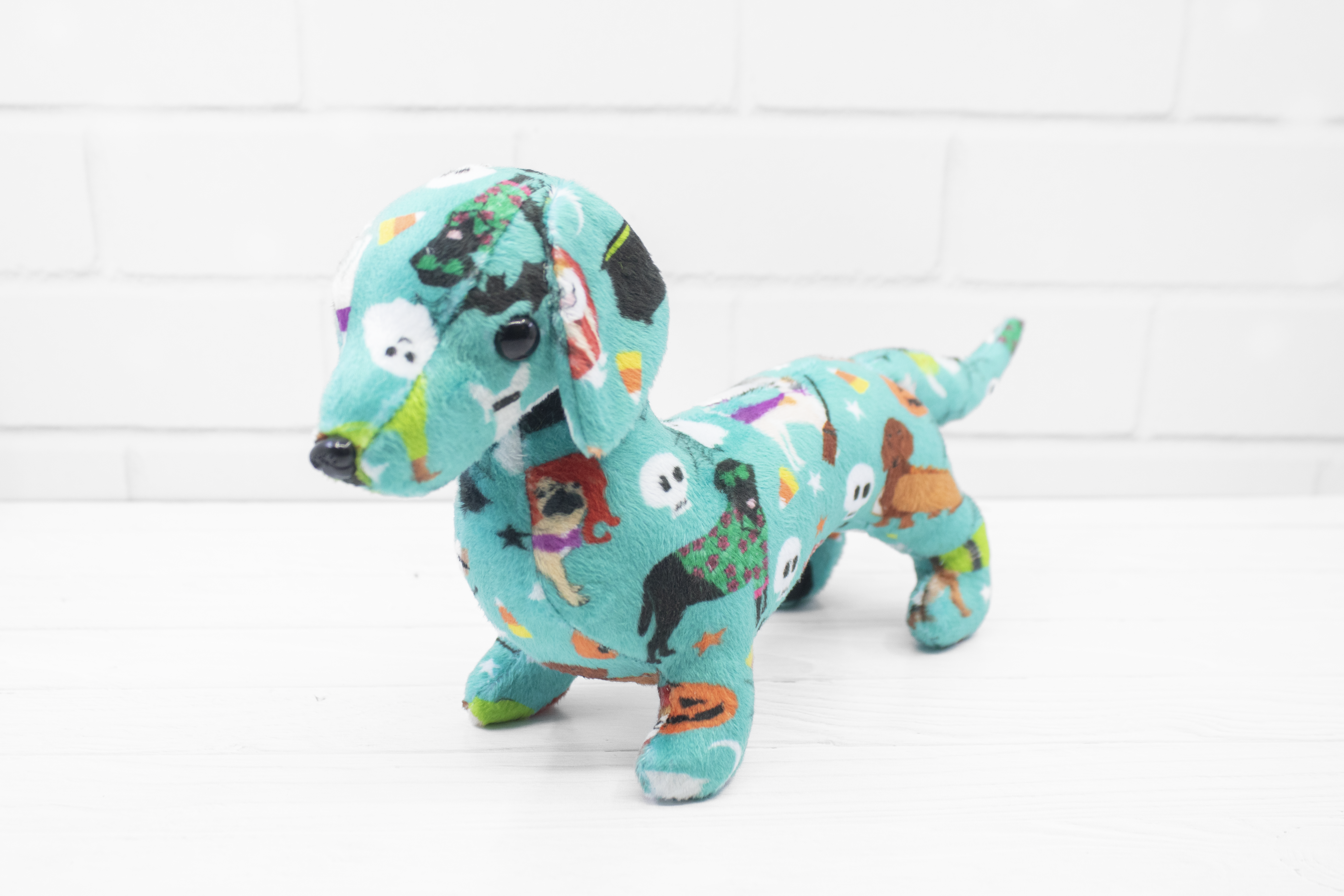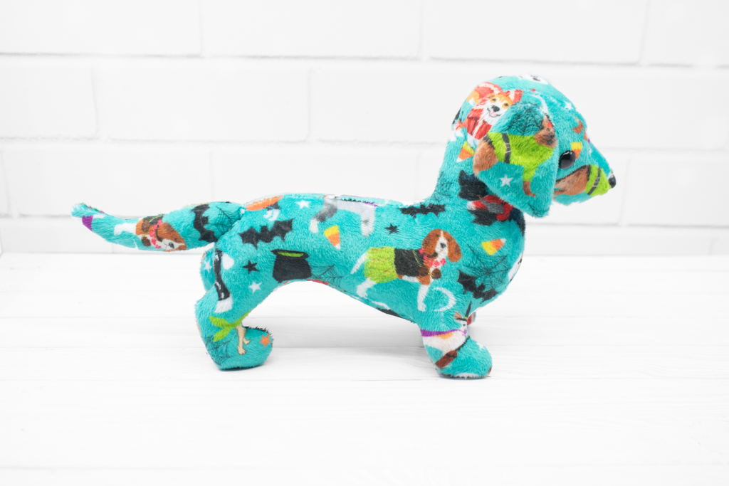 This adorable handmade dachshund plush is ready for some Halloween fun! Made from soft printed minky, this pup features a vibrant teal colored fabric with images of dogs wearing their cutest Halloween costumes! Each one is lovingly sewn by hand giving them unique personality and charm. They're the perfect buddies to go trick or treating with!
