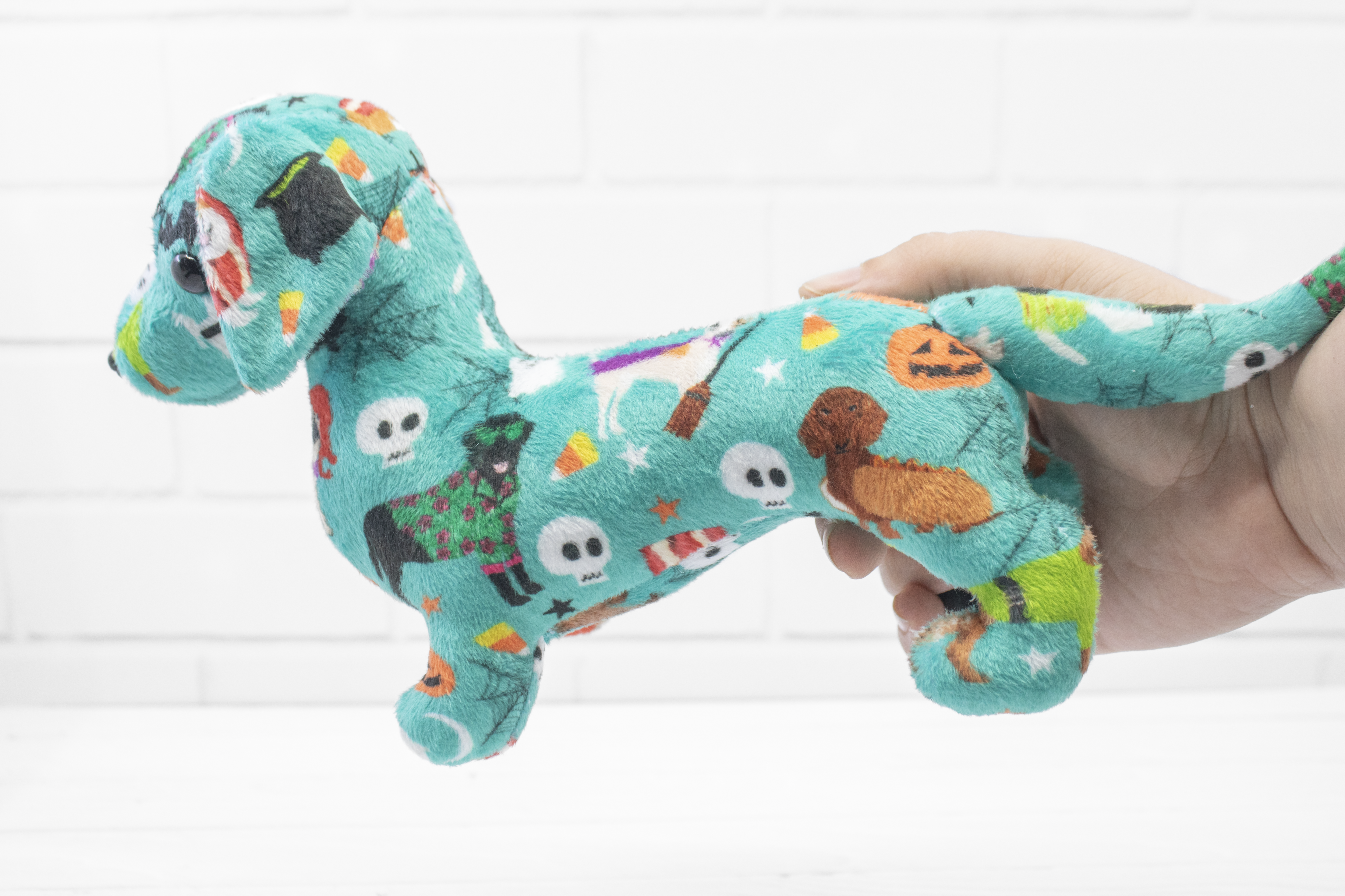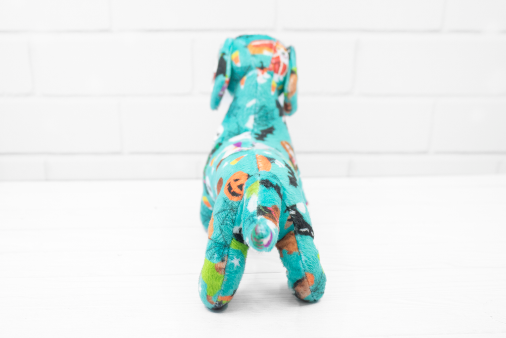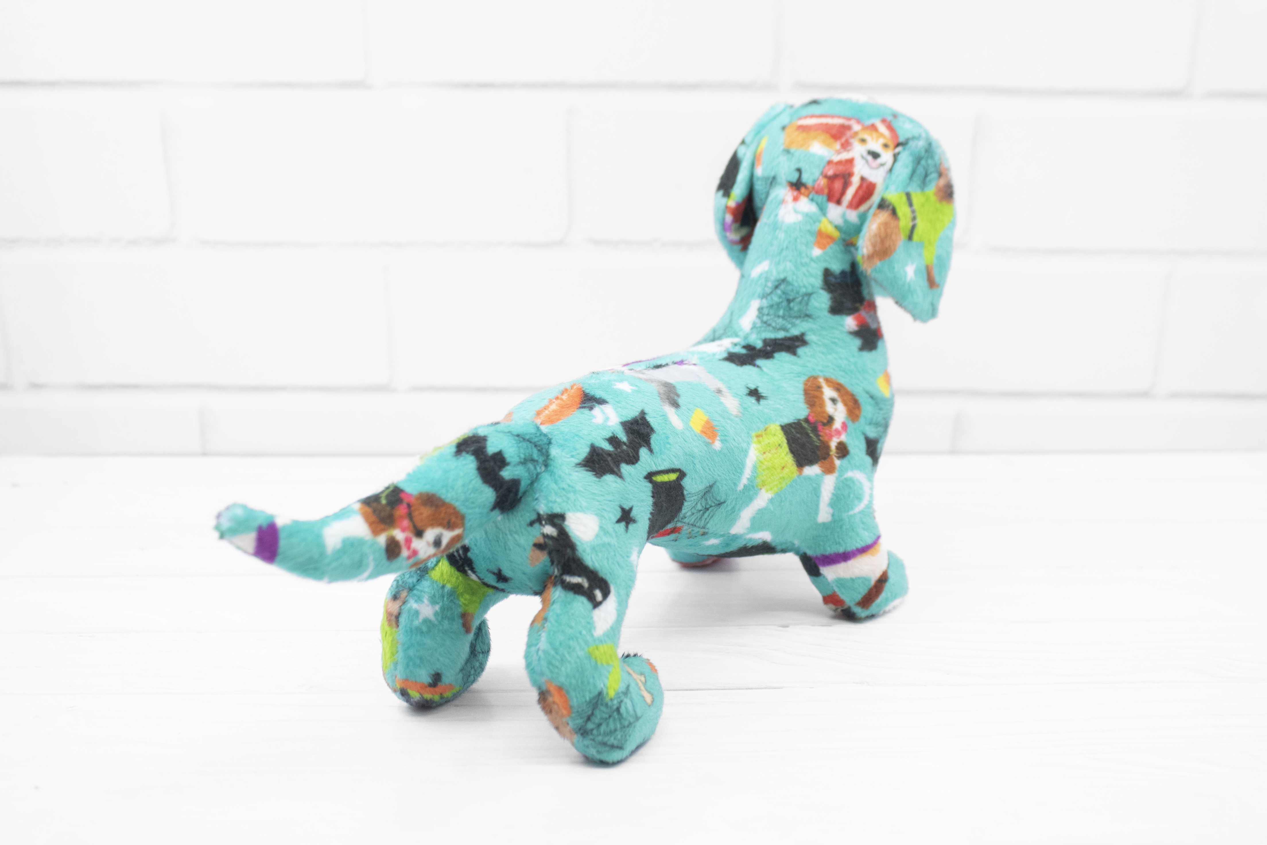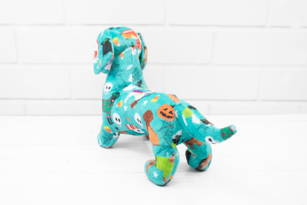 This adorable handmade dachshund plush is ready for some Halloween fun! Made from soft printed minky, this pup features a vibrant teal colored fabric with images of dogs wearing their cutest Halloween costumes! Each one is lovingly sewn by hand giving them unique personality and charm. They're the perfect buddies to go trick or treating with!