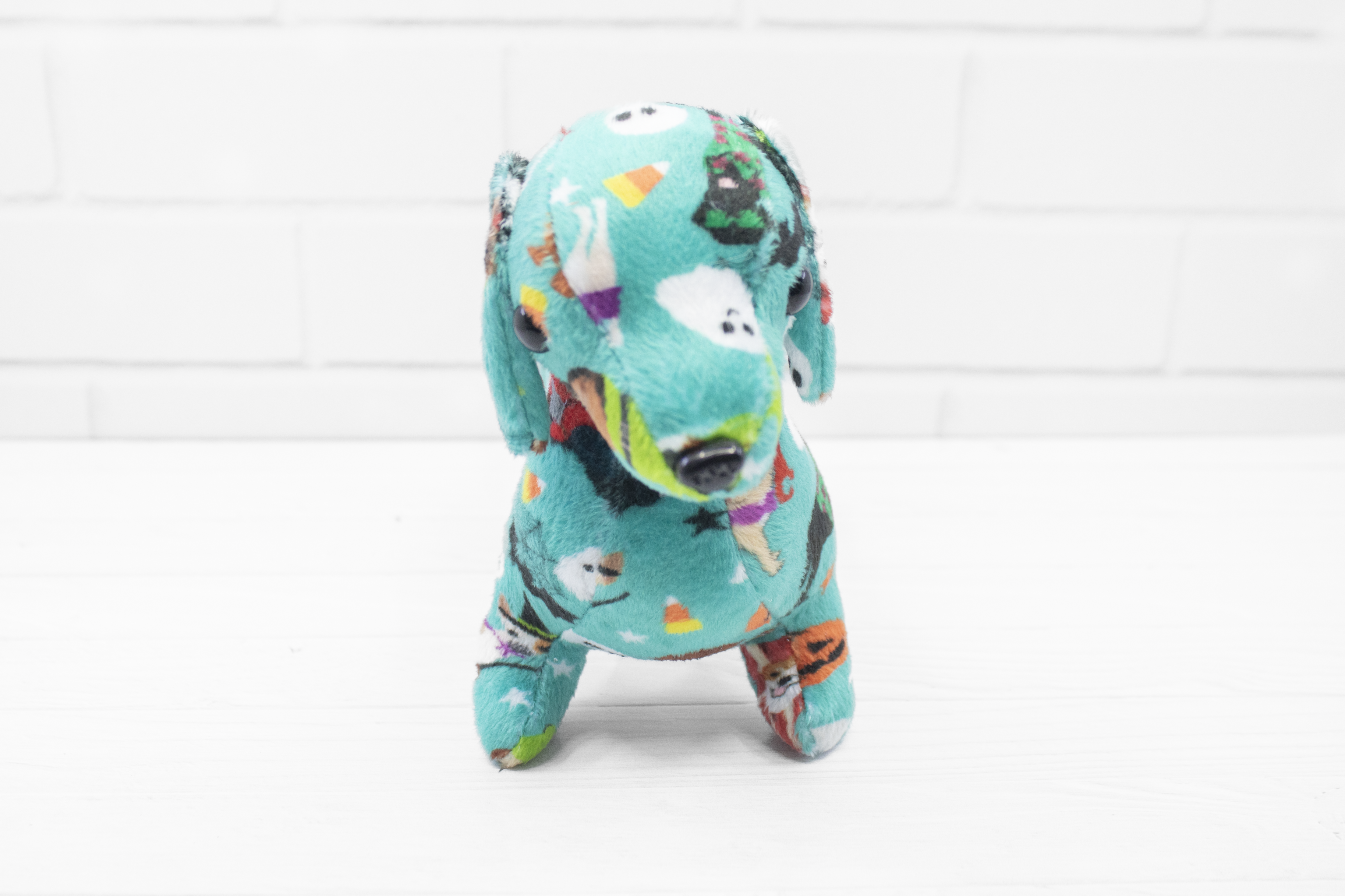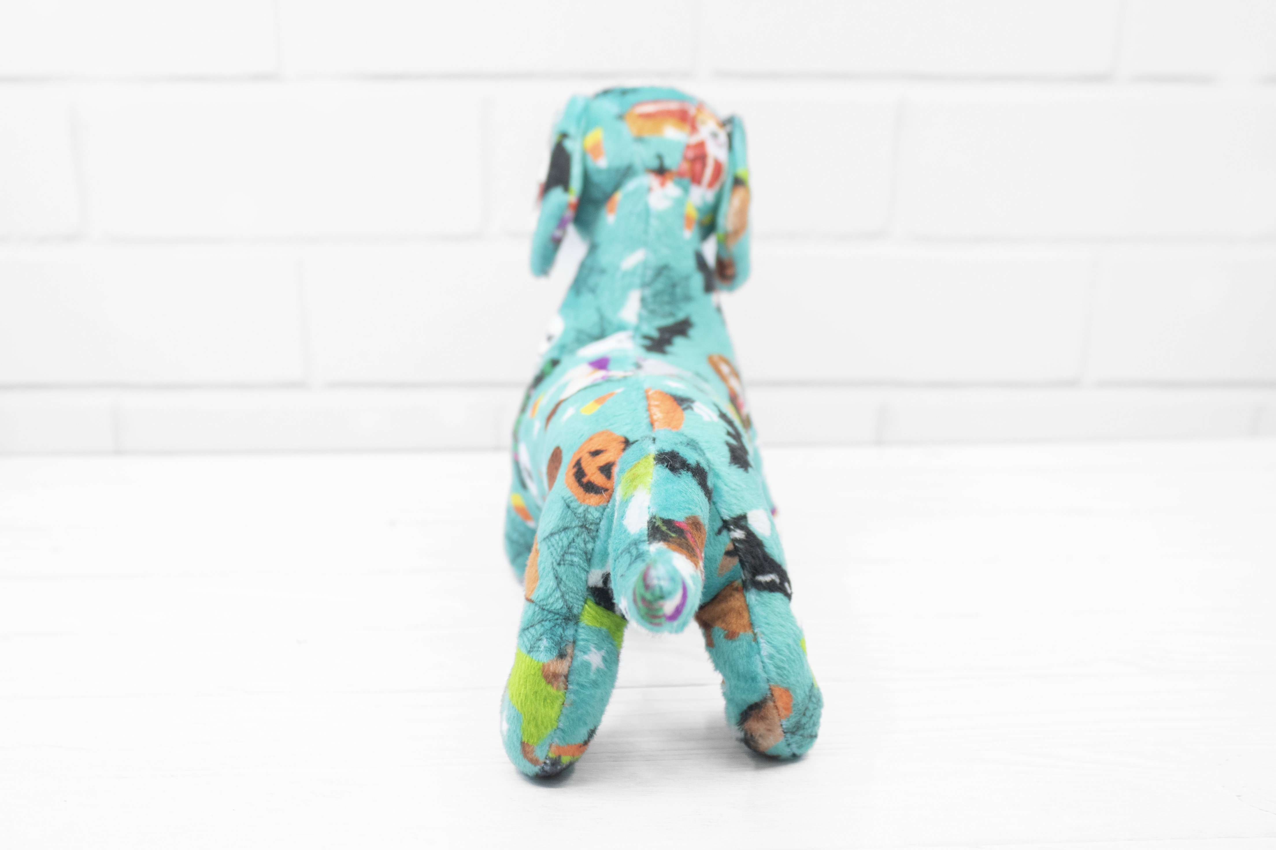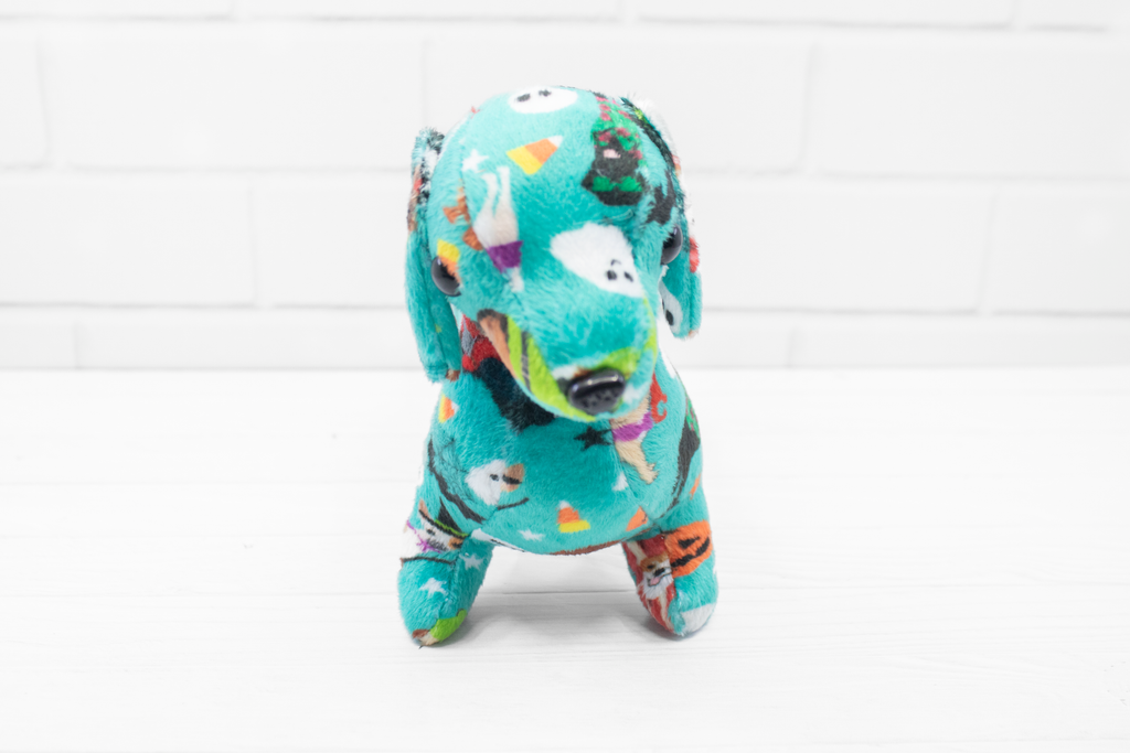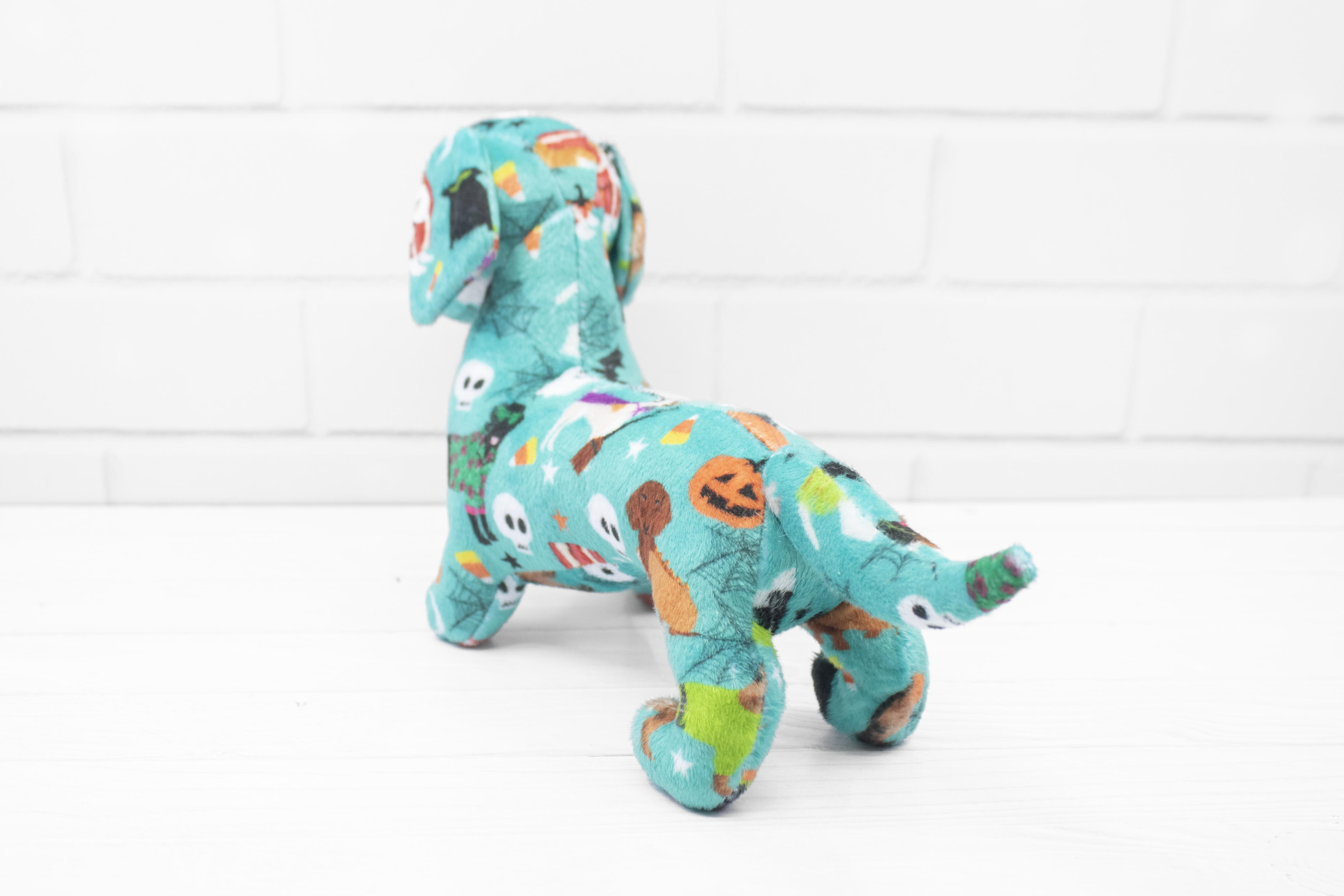 This adorable handmade dachshund plush is ready for some Halloween fun! Made from soft printed minky, this pup features a vibrant teal colored fabric with images of dogs wearing their cutest Halloween costumes! Each one is lovingly sewn by hand giving them unique personality and charm. They're the perfect buddies to go trick or treating with!