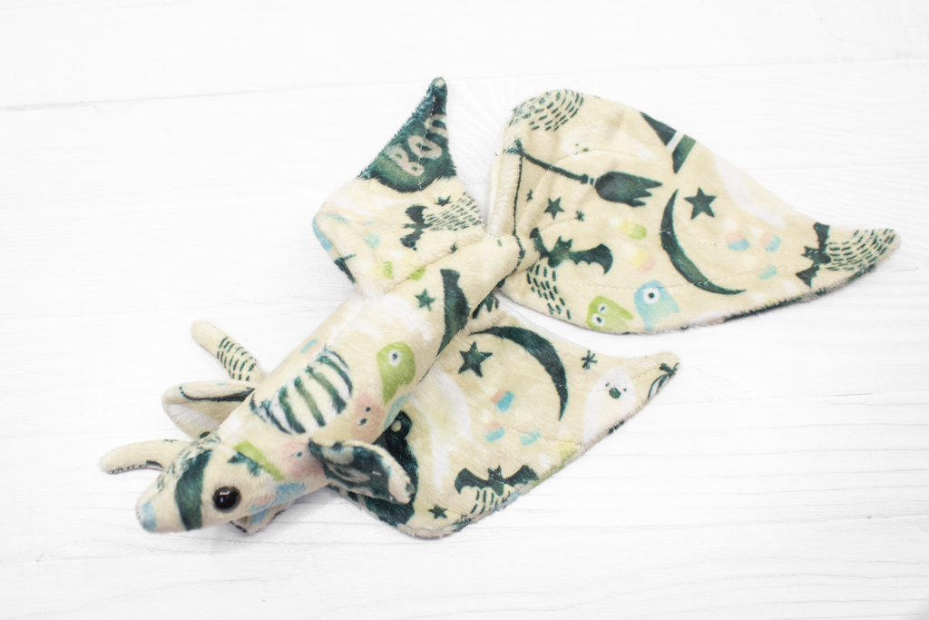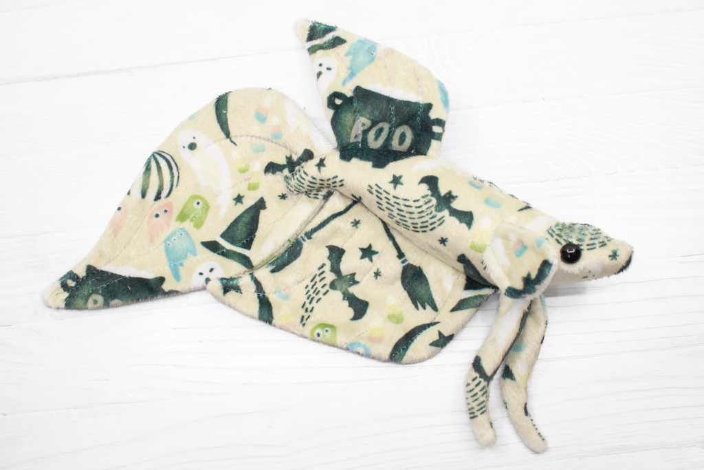 Bring a touch of Halloween fun to your space with this handmade betta fish plush. Created with printed minky this betta features colorful Halloween designs on a tan background. One bat has a happy ghost charm as it's neck and the other has an angry one. It would make the perfect companion during spooky season celebrations.