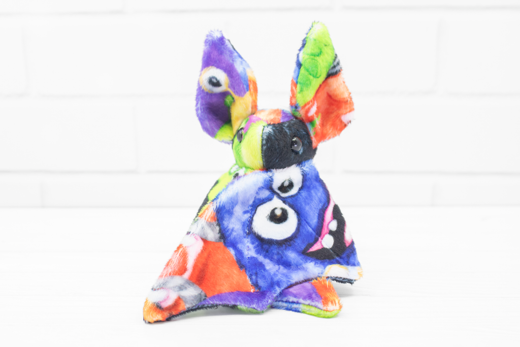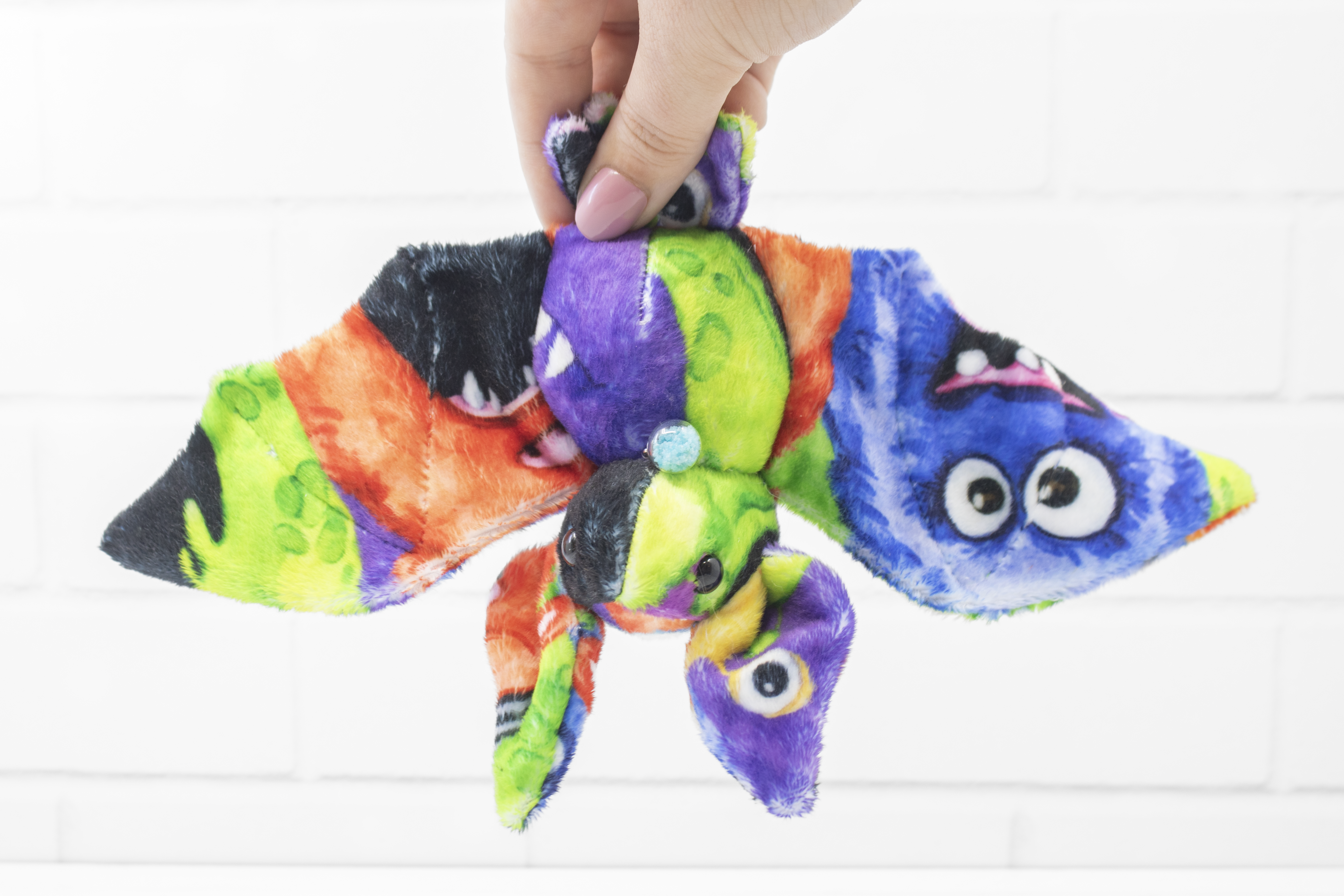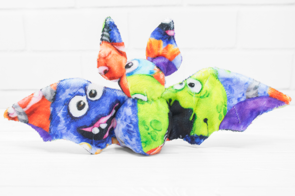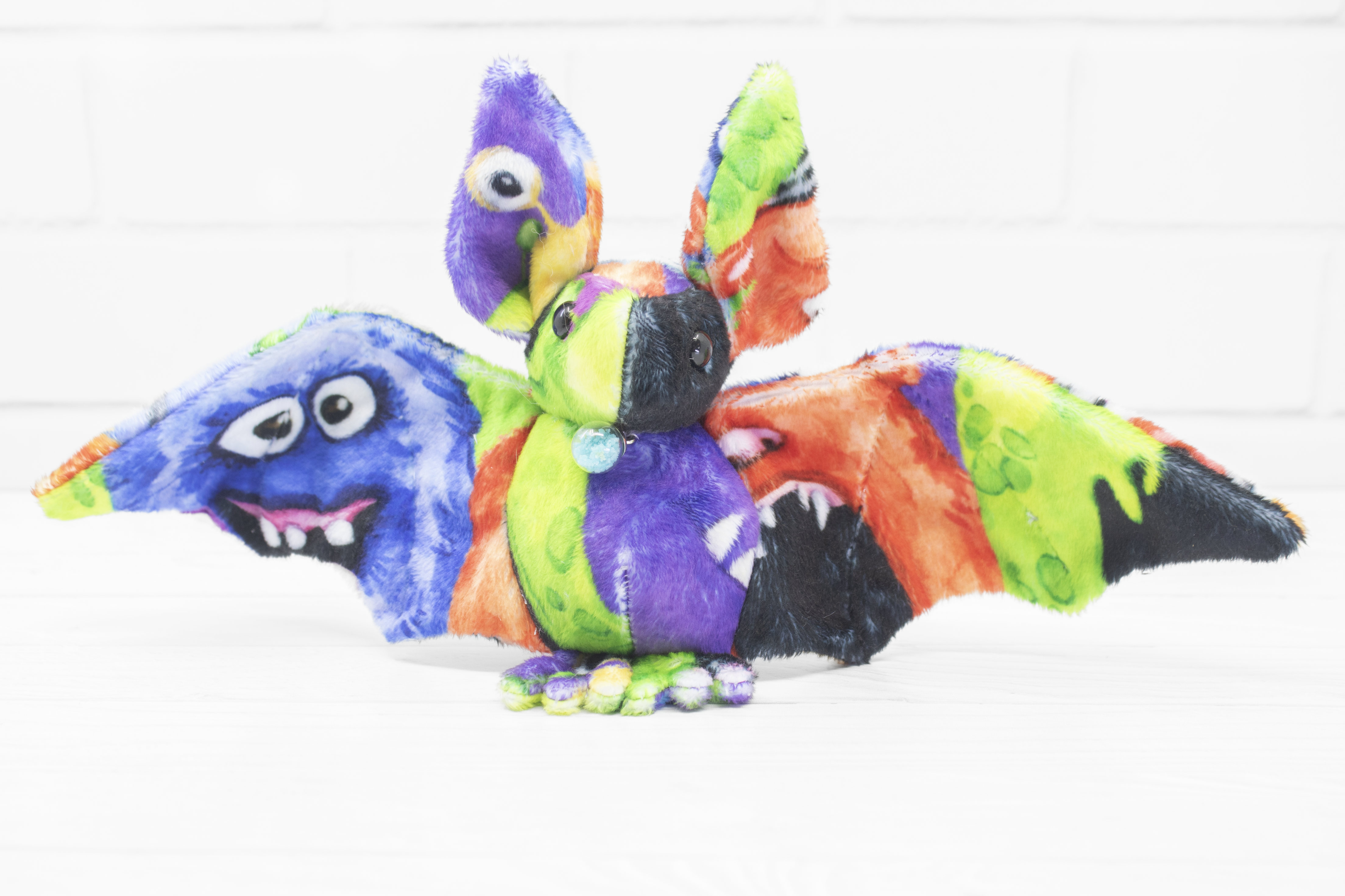 It may look scary, but I promise this monster bat is super sweet! Made from soft minky, this handmade bat plushie features colorful and cute monster fabric. At it's neck is a glass globe charm that glows in the dark with a very fun blue color. It's monstrously cute 😉