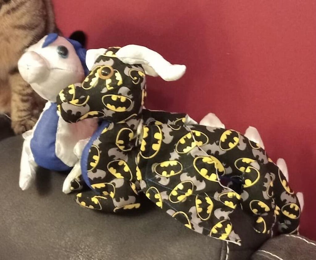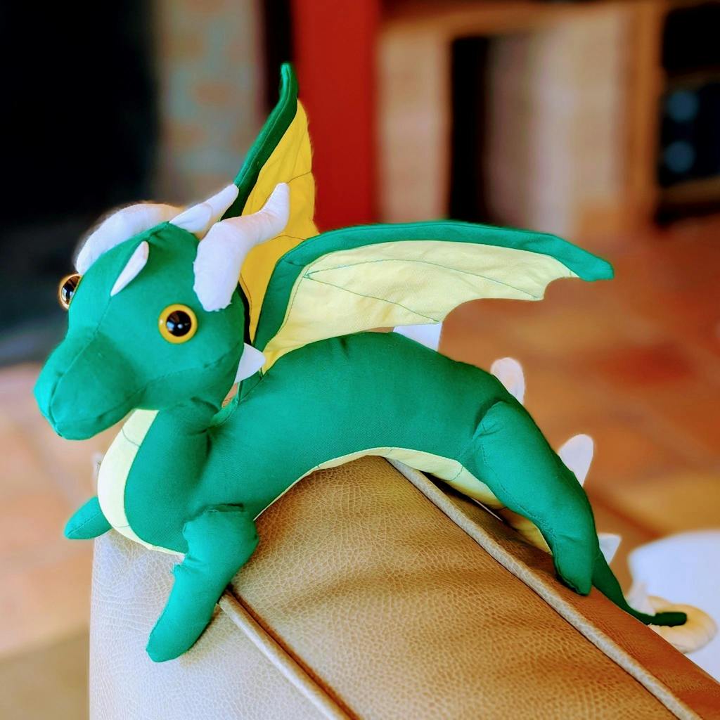 Create a fun, fantasy friend who will perch on your shoulder with this shoulder dragon plush sewing pattern. This dragon stuffed animal is designed to sit nicely on a shoulder, but can also stand on its own which looks like it is jumping. It does not use wires or other armature so it remains perfectly snuggleable.