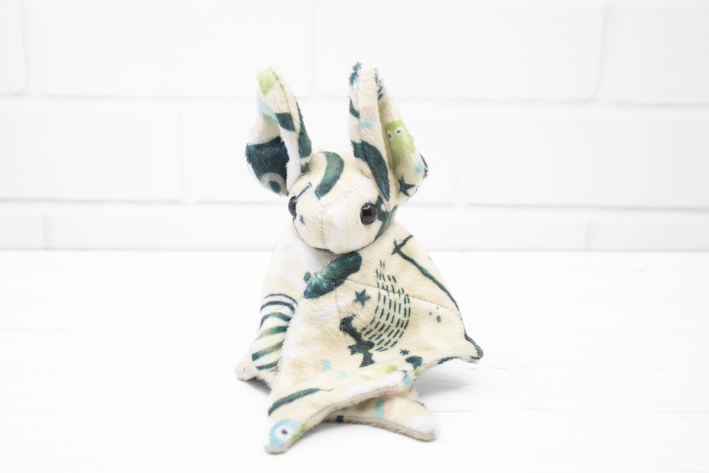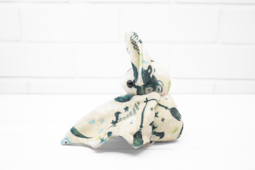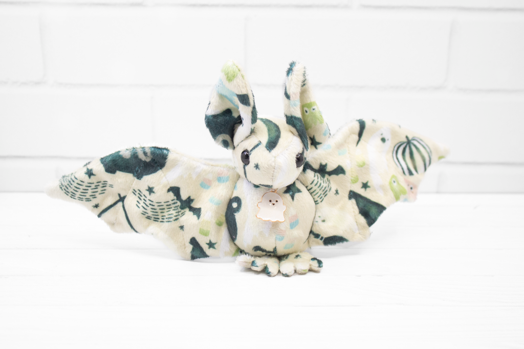 Bring a touch of Halloween fun to your space with this handmade bat plush. Created with printed minky this bat features colorful halloween designs on a tan background. One bat has a happy ghost charm as it's neck and the other has an angry one. It would make the perfect companion during spooky season celebrations.