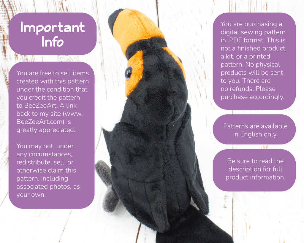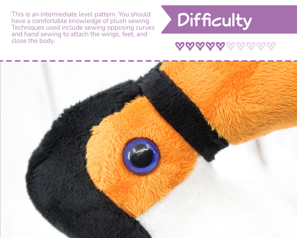 This is an intermediate level pattern. You should have a comfortable knowledge of plush sewing. Techniques used include sewing opposing curves and hand sewing to attach the wings, feet, and close the body.