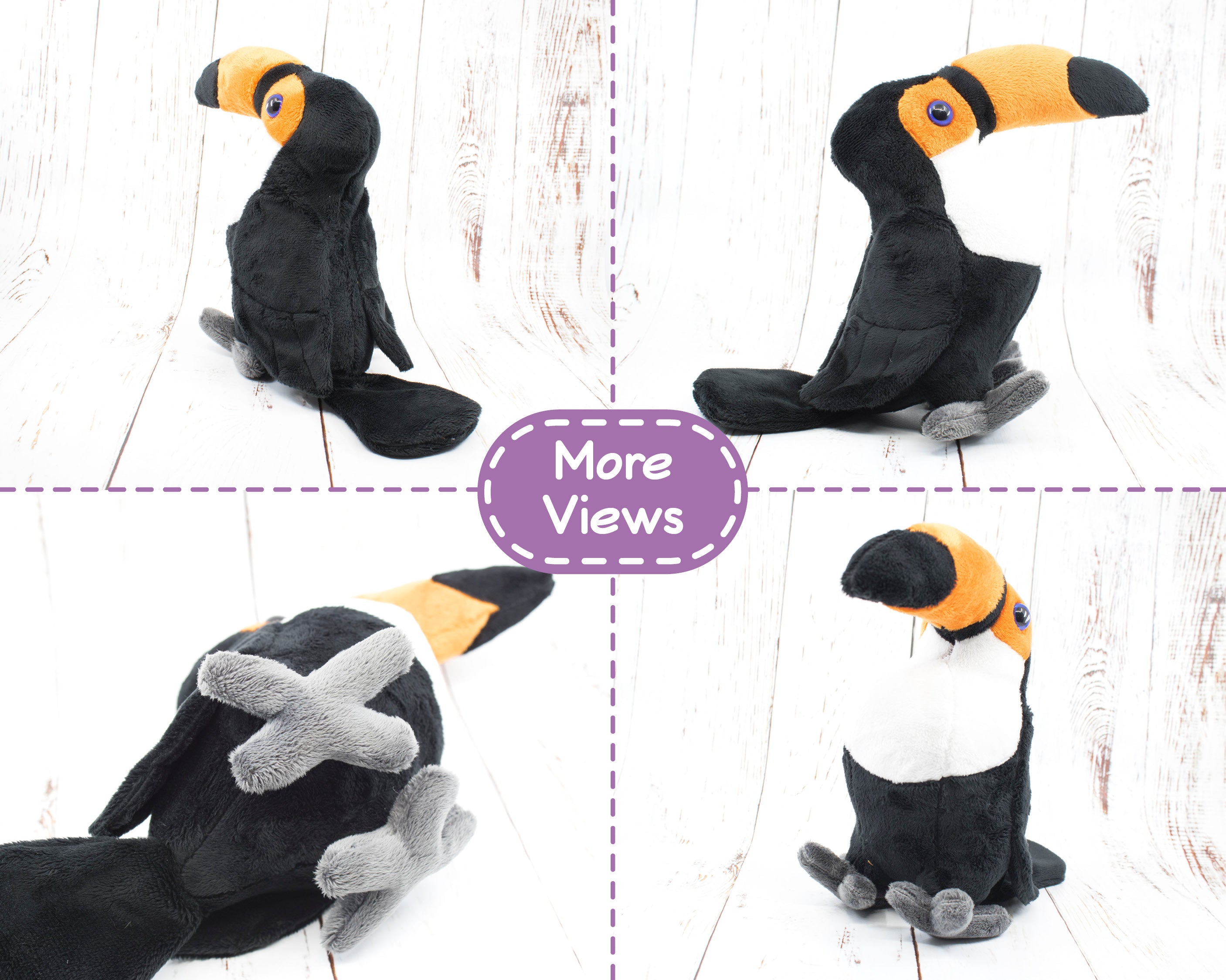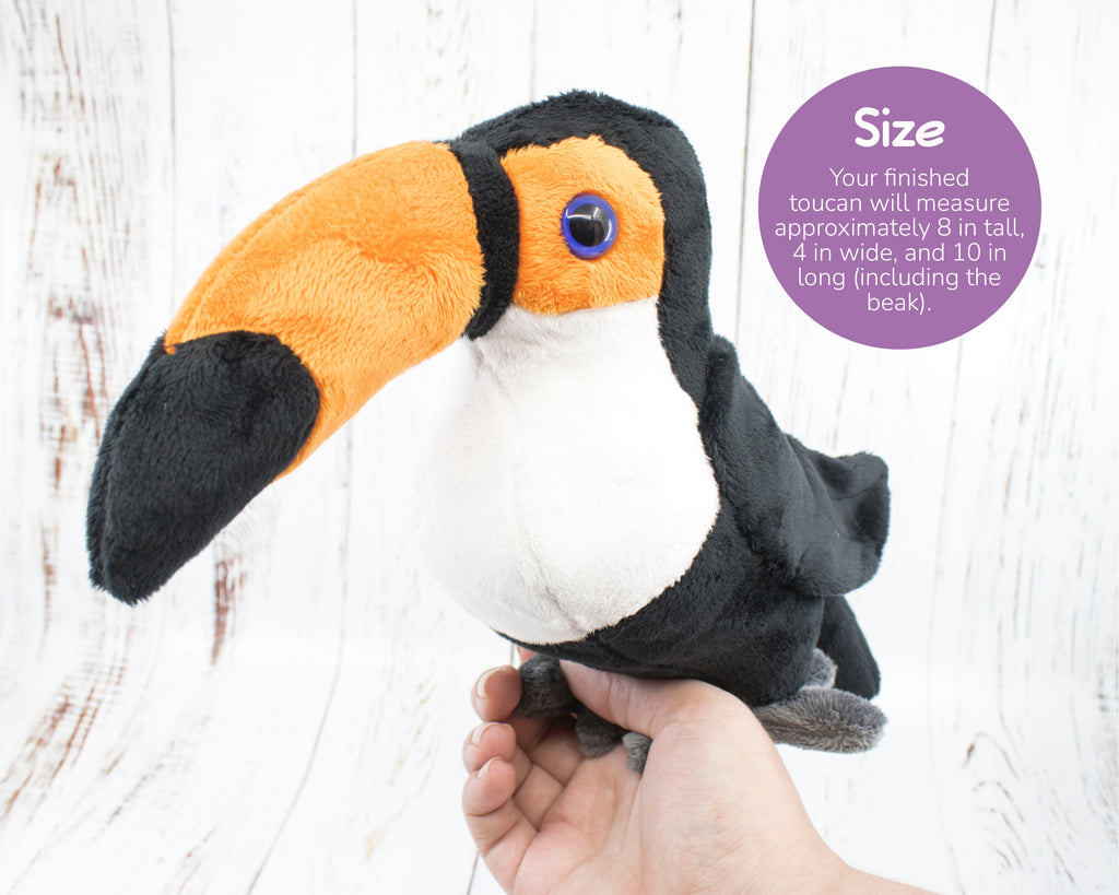 Your finished toucan will measure approximately 8 inches tall, 4 inches wide, and 10 inches long (including the beak).