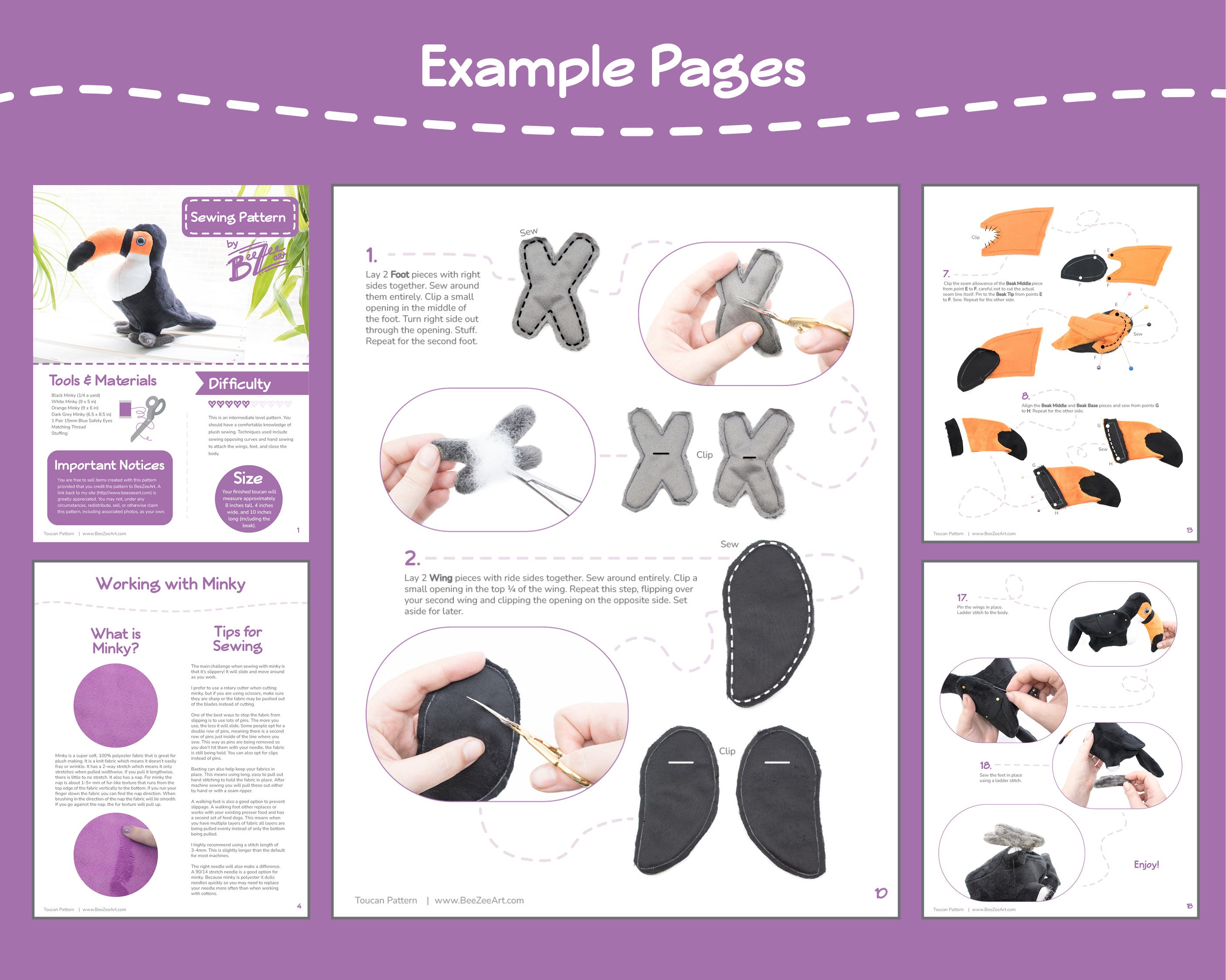 Toucan pattern itself, printing instructions with 1/4 seam allowance and exact sewing lines, suggested cutting layouts, 2 pages of sewing tips, and a step by step written tutorial along with accompanying full color photographs to help you complete your project.