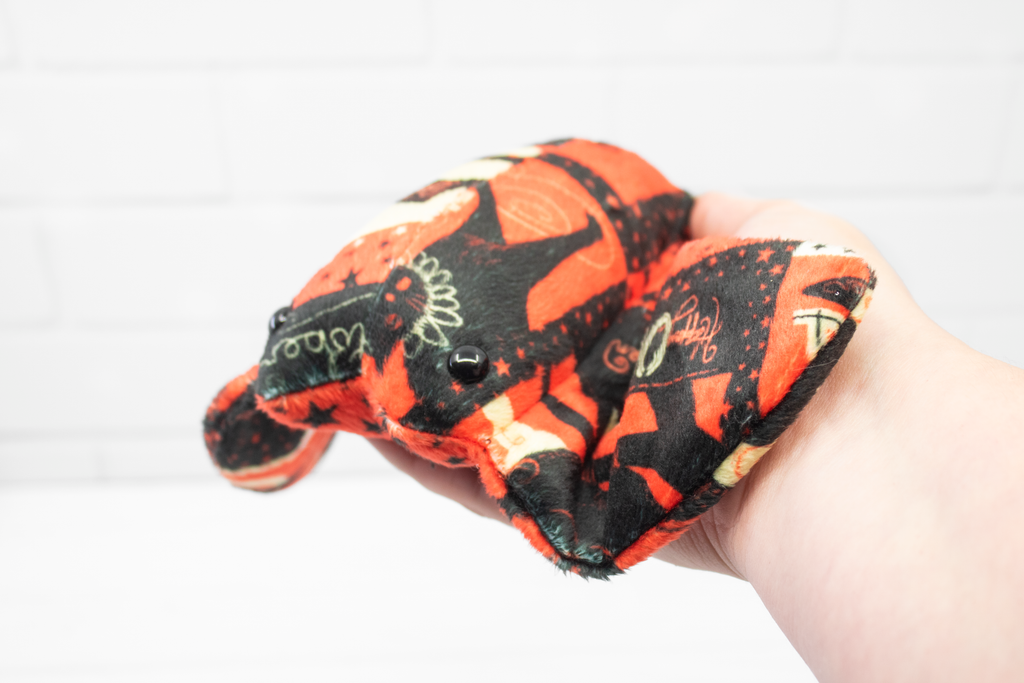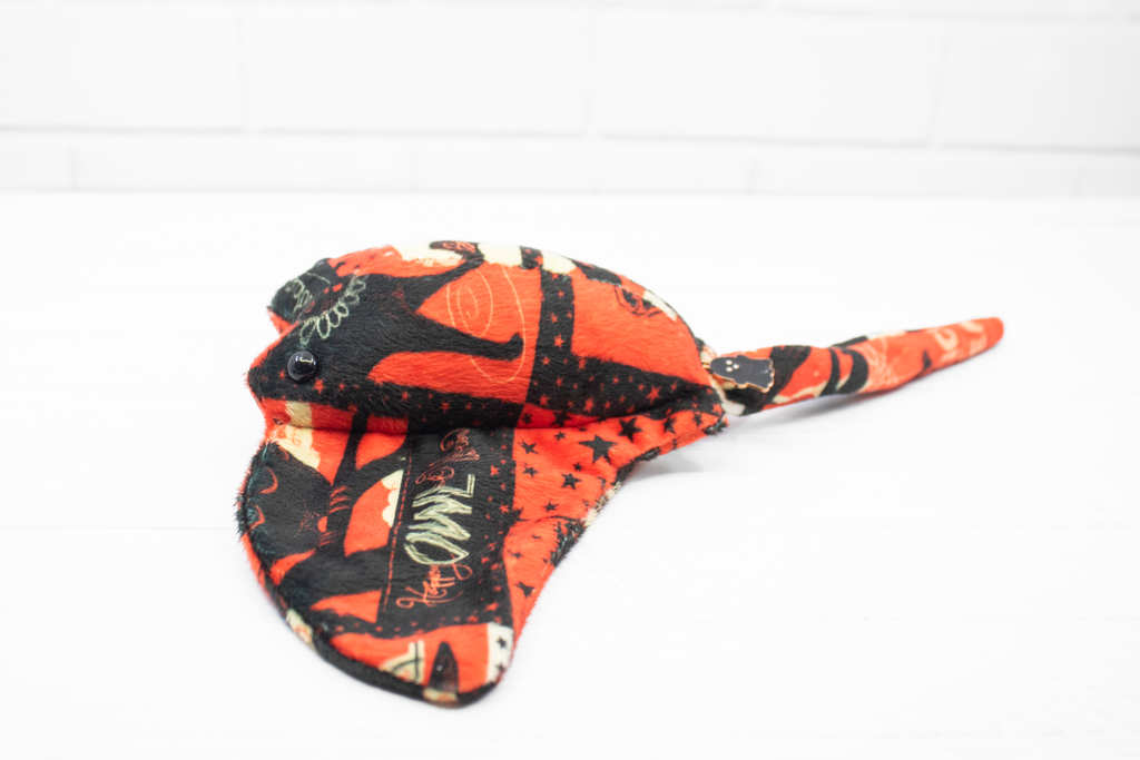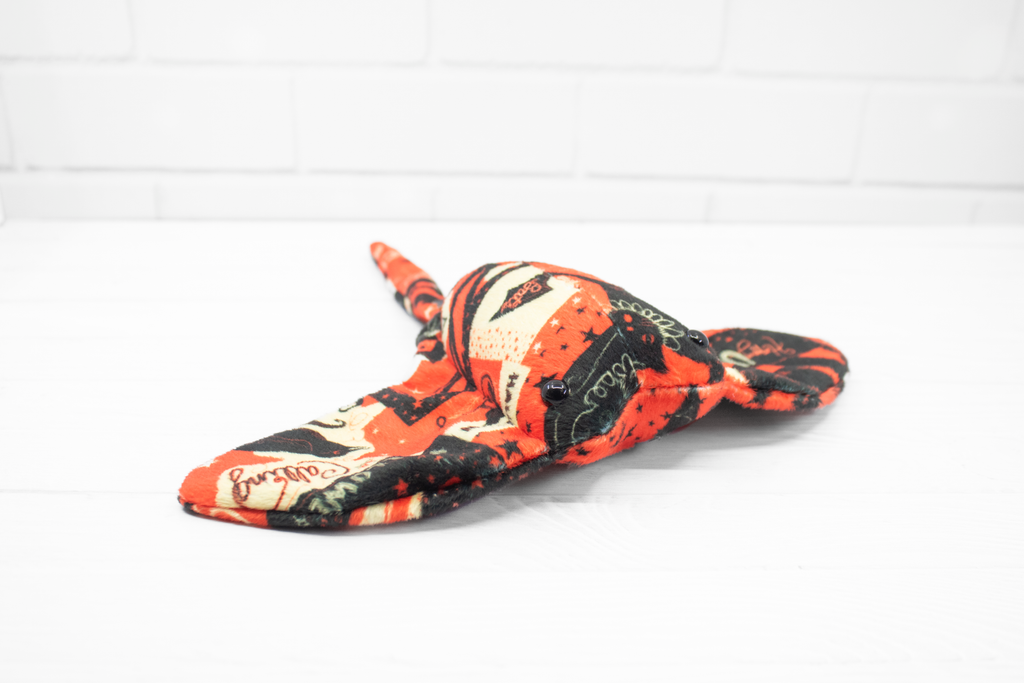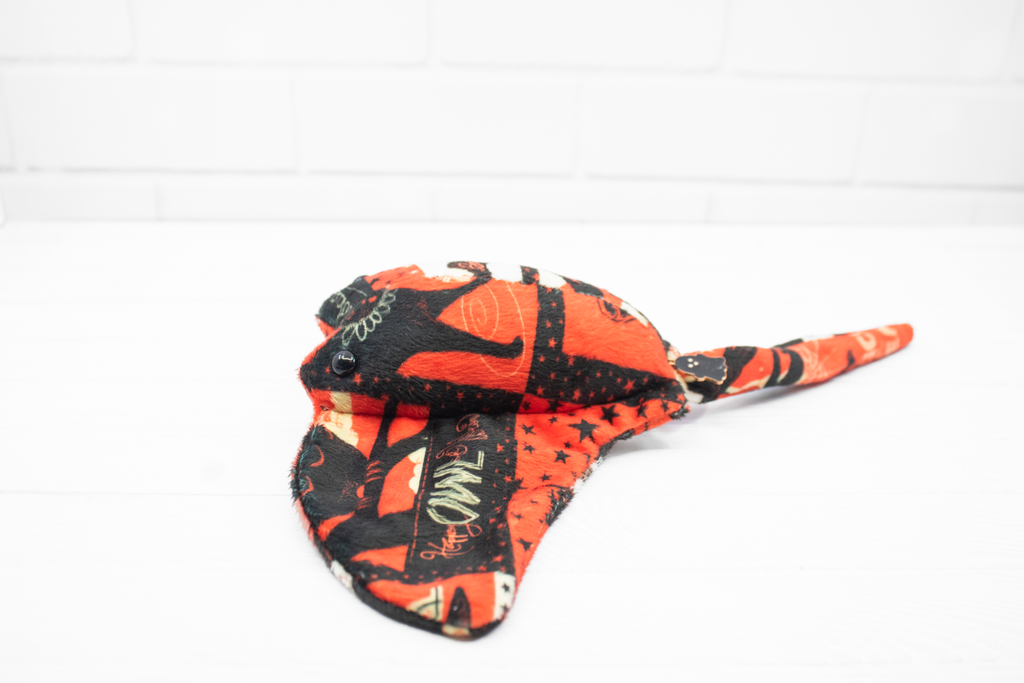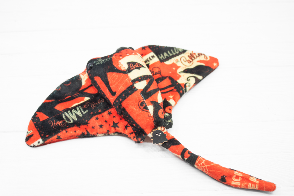 Add a little vintage magic to your collection with this handmade Halloween stingray plush! Made from super soft minky, this stingray features a patchwork of vintage-style Halloween cards. It also has a little black ghost charm at the base of its tail. It's a bright and soft friend for those cold autumn nights.