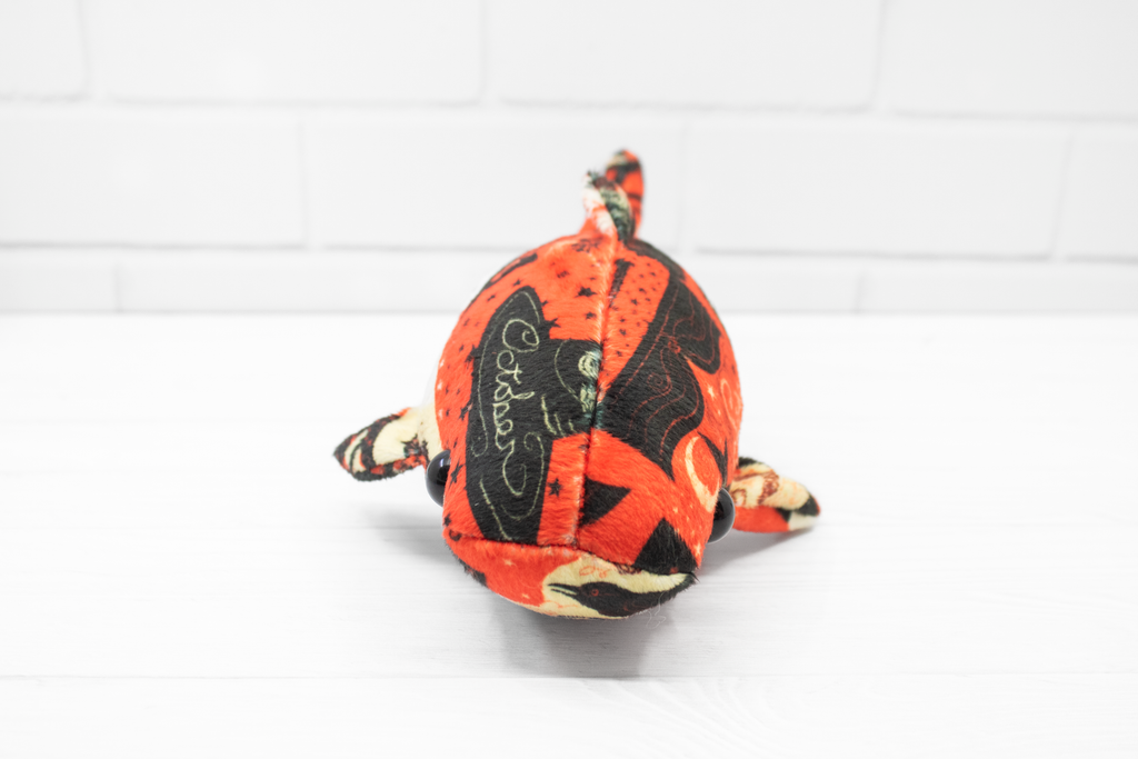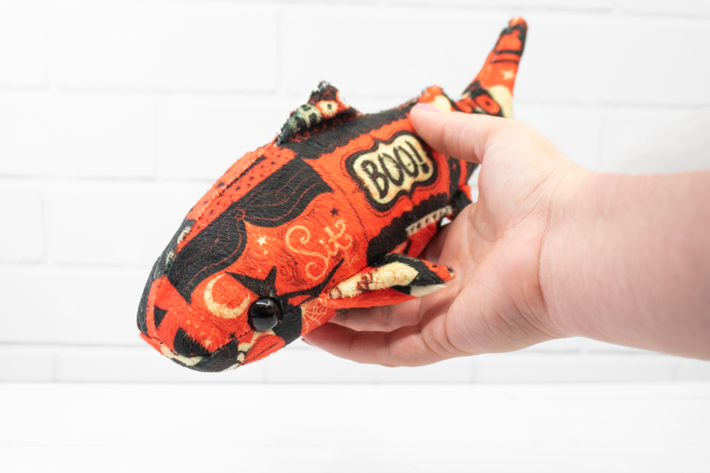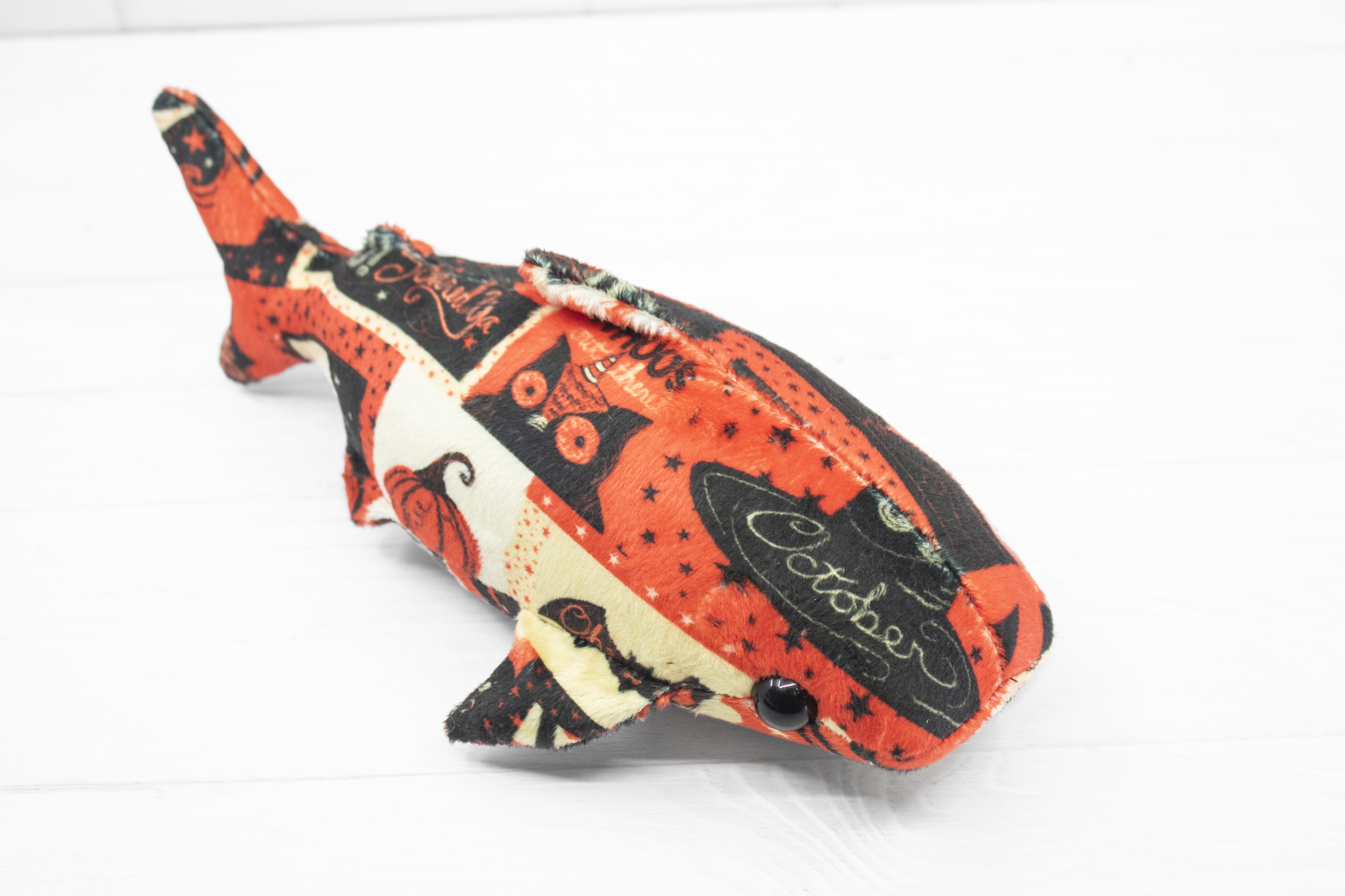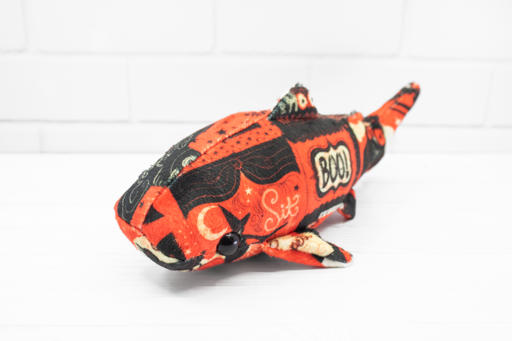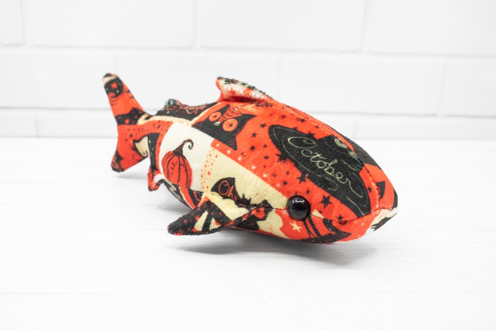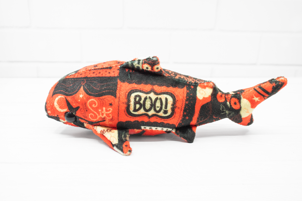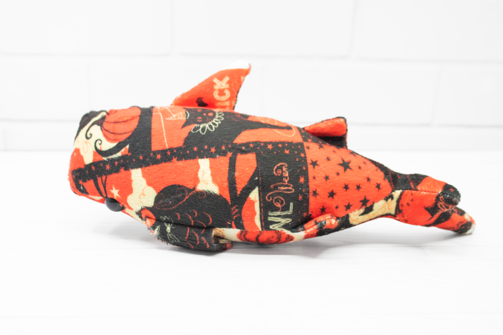 Add a little vintage magic to your collection with this handmade Halloween whale shark plush! Made from super soft minky, this whale shark features a patchwork of vintage-style Halloween cards. It's a bright and soft friend for those cold autumn nights.