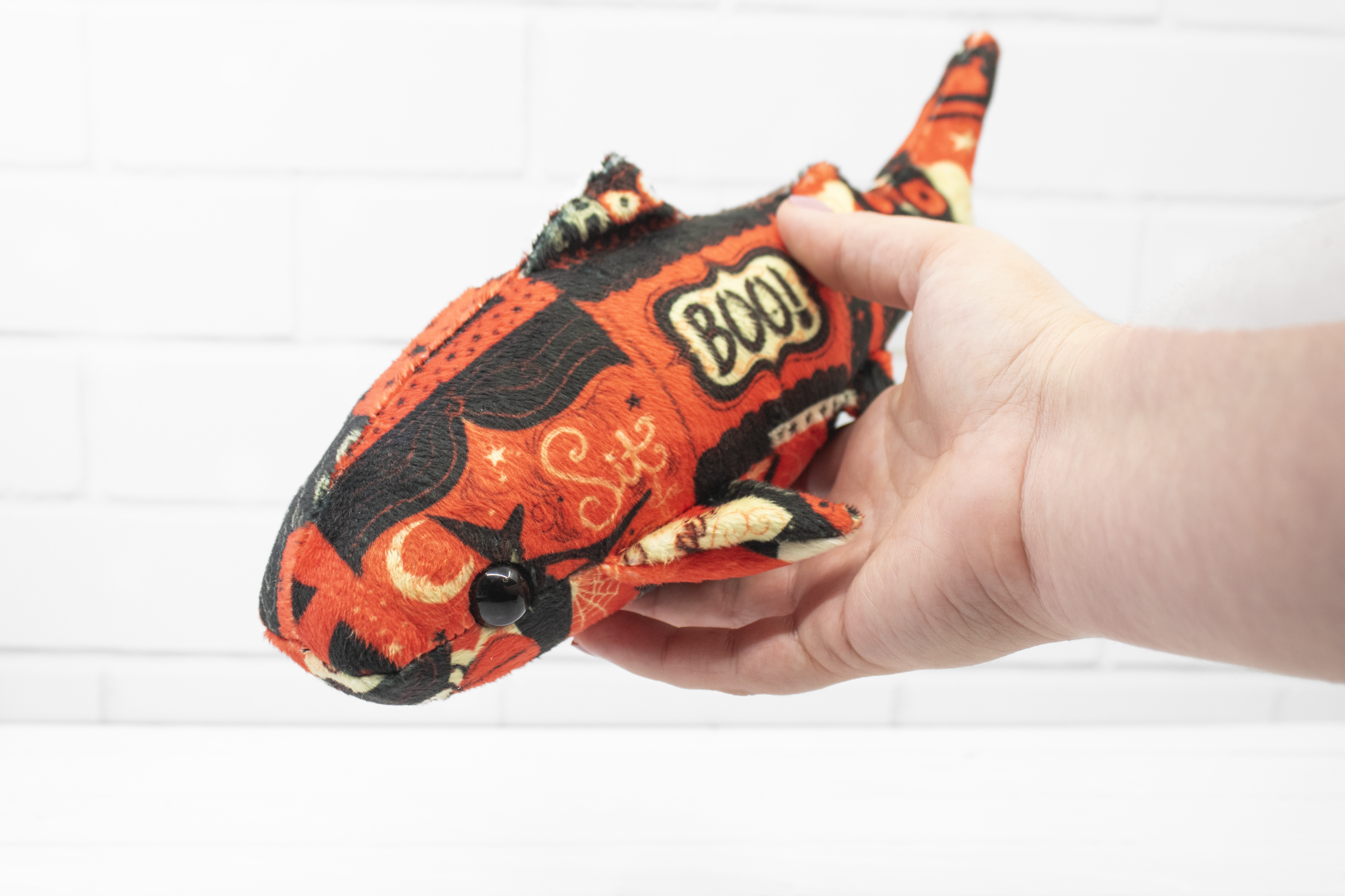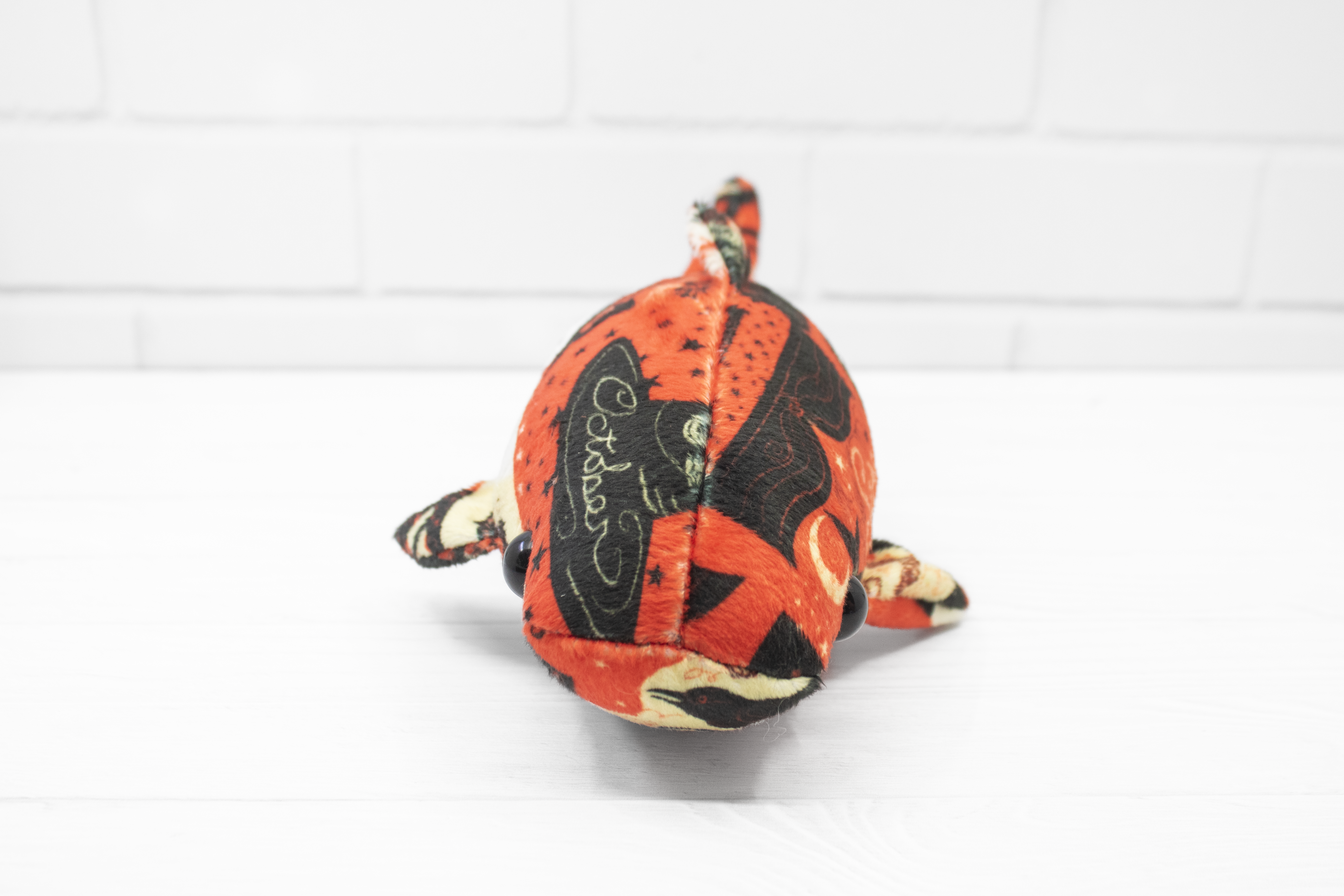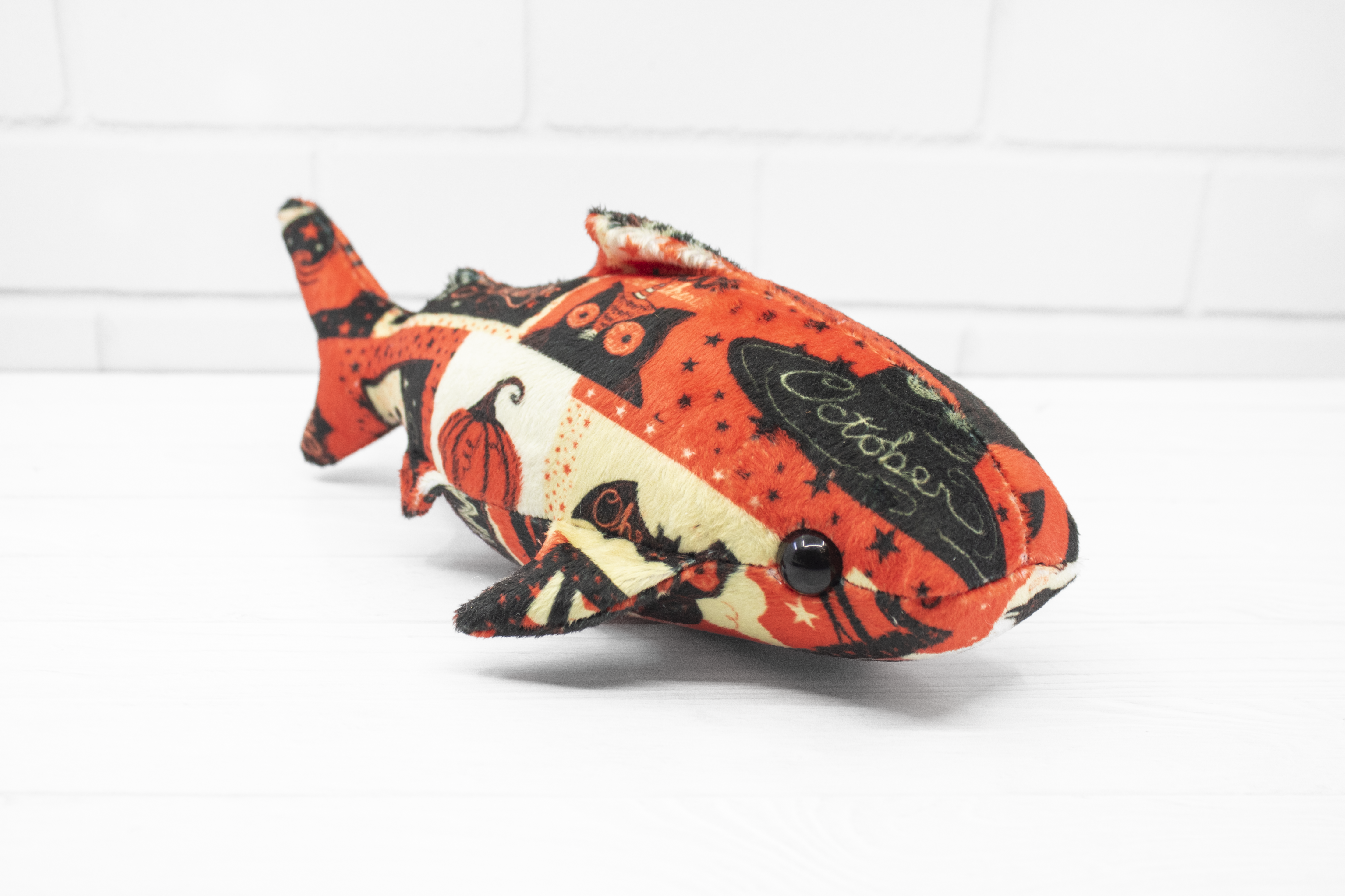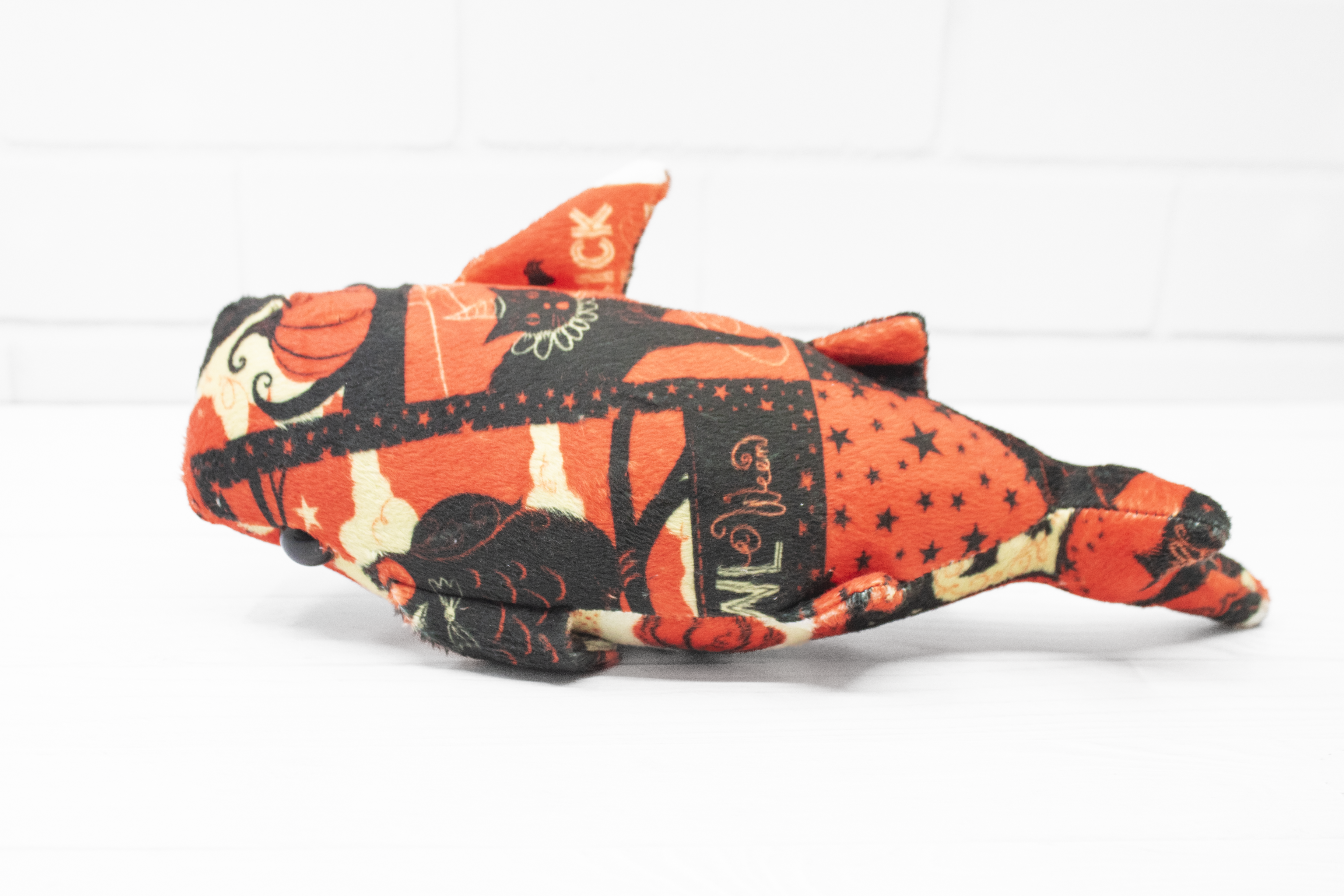 Add a little vintage magic to your collection with this handmade Halloween whale shark plush! Made from super soft minky, this whale shark features a patchwork of vintage-style Halloween cards. It's a bright and soft friend for those cold autumn nights.